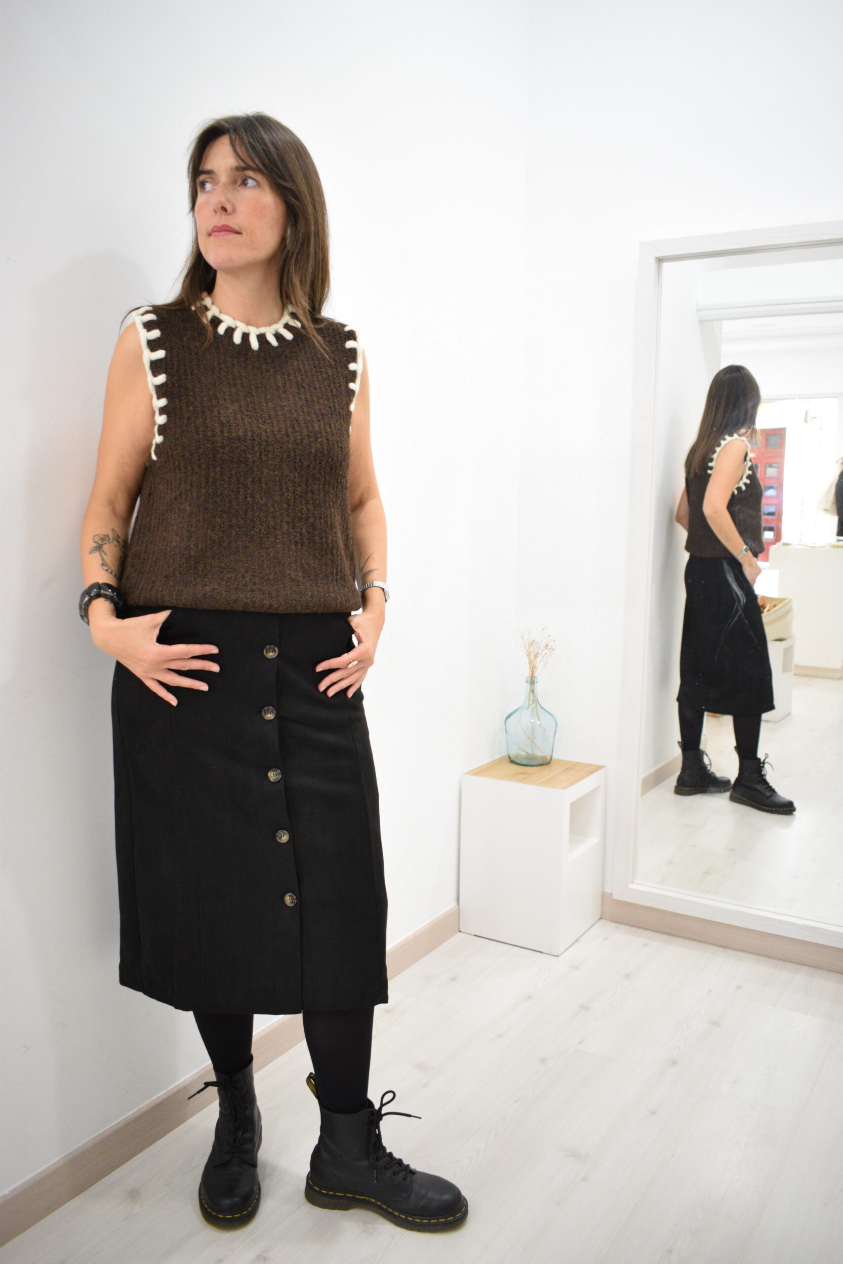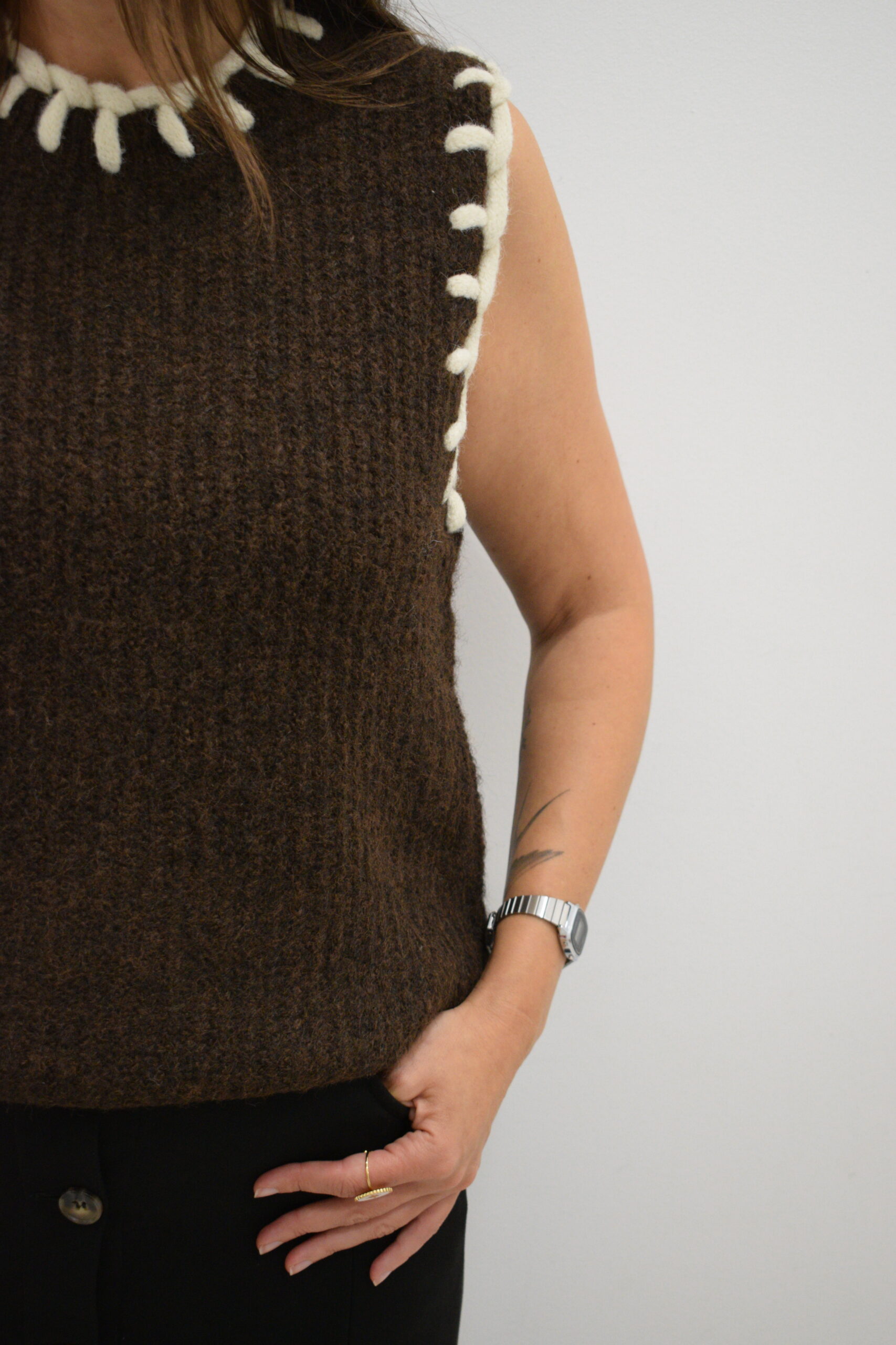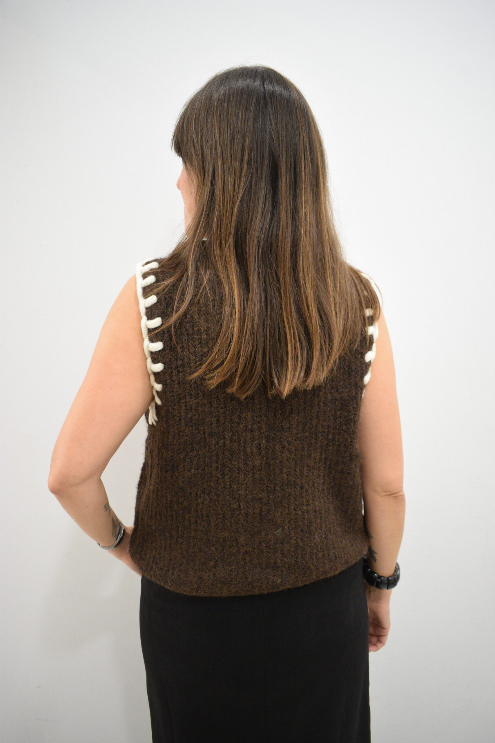 Chaleco marrón Marc de punto canalé con cordón grueso del mismo tono alrededor de cuello y mangas.