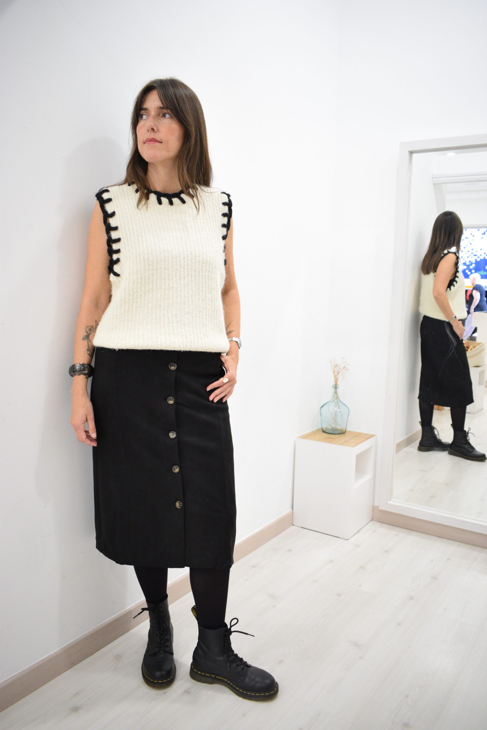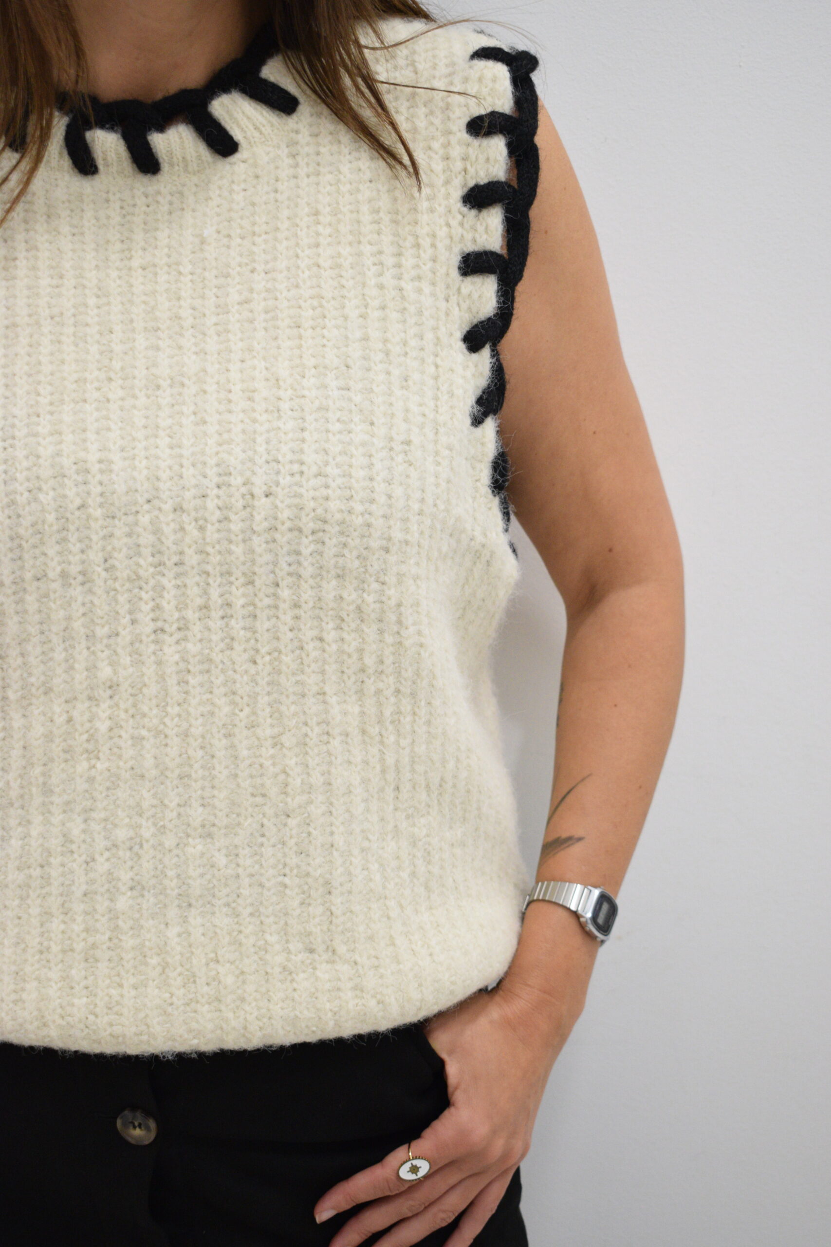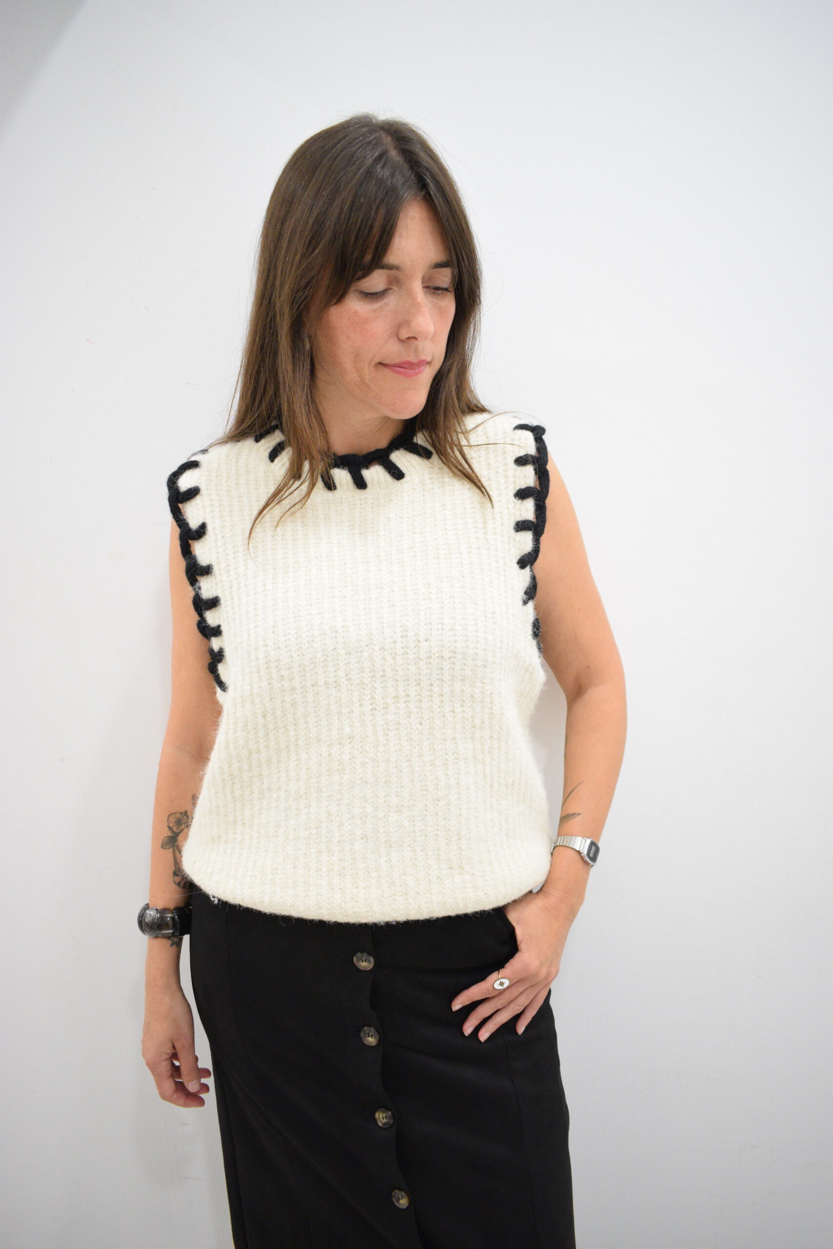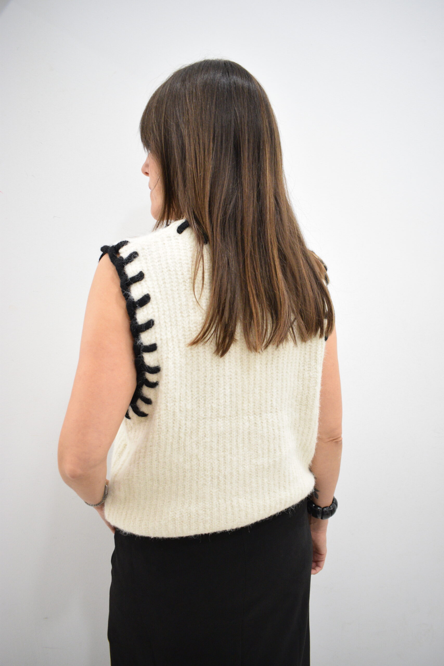 Chaleco crudo Marc de punto canalé con cordón grueso del mismo tono alrededor de cuello y mangas.