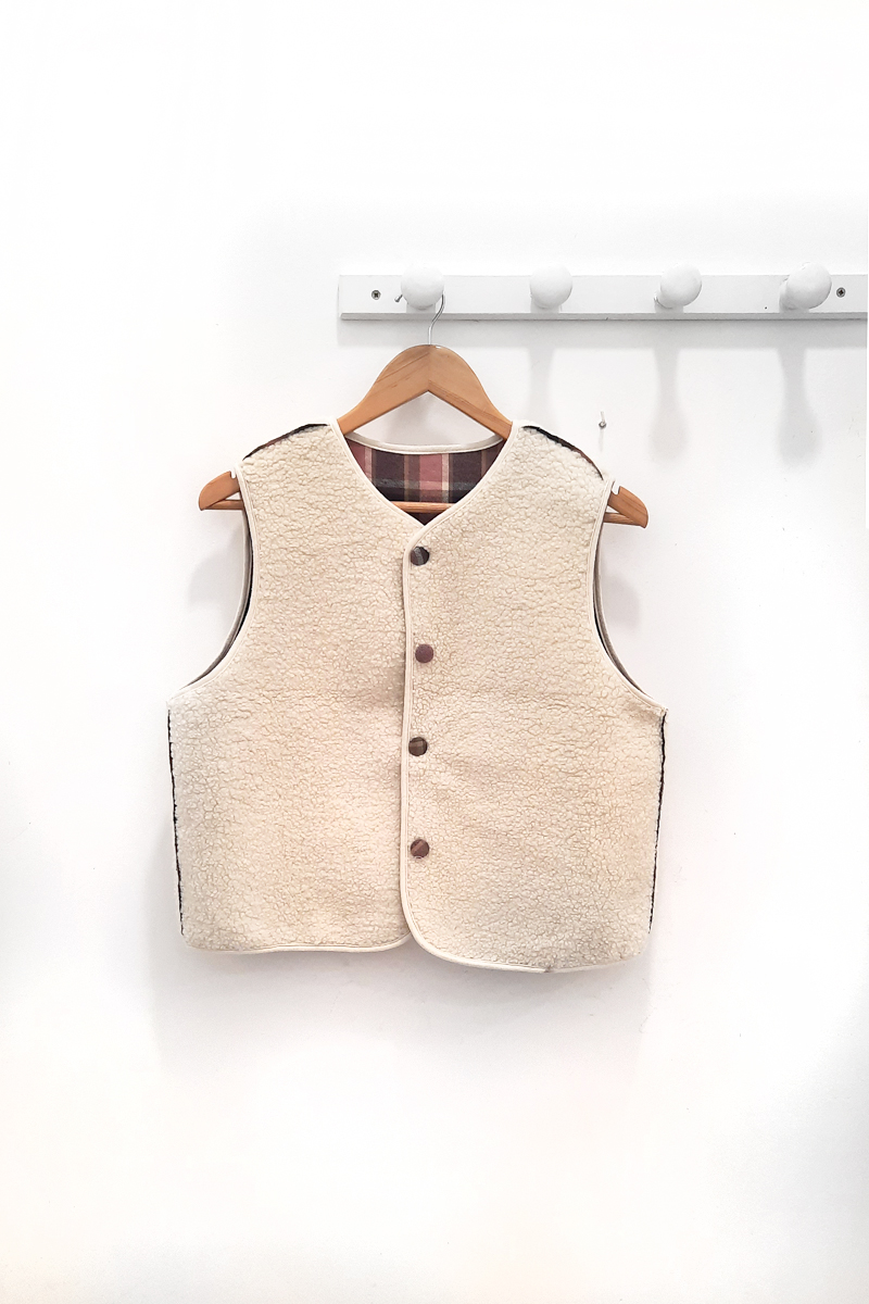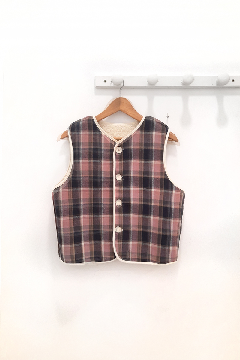 Chaleco rosa reversible Mildred de cuadros en rosa, beige, crudo y gris, con botonera en crudo y cuello en pico. Borreguillo en la parte reversibe con botones del mismo estampado de cuadros.