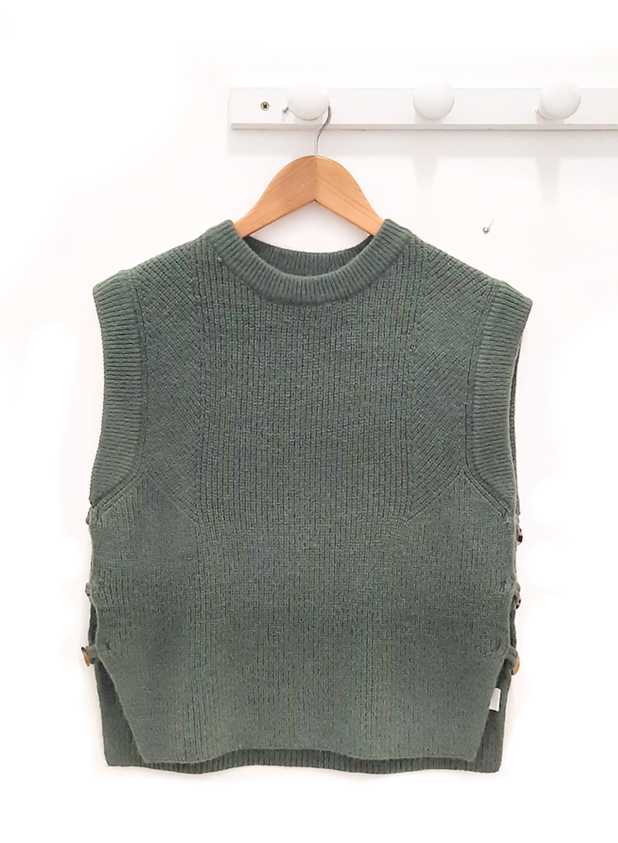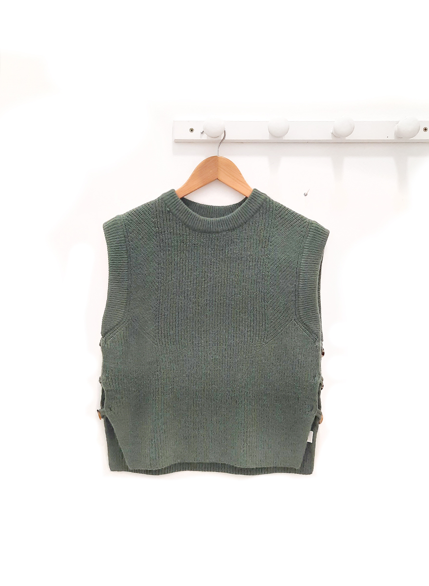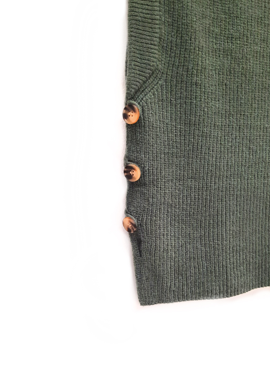 Chaleco verde de punto Rubens con cuello redondo y tres botones marrón claro oscuro en ambos laterales cerrando la prenda.