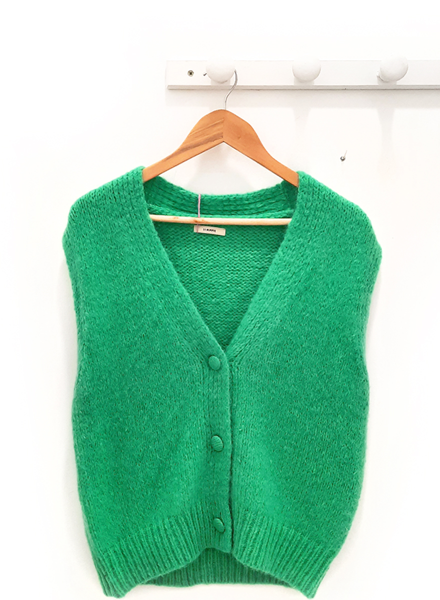 Chaleco verde Funny de punto con cuello en pico y tres botones forrados del mismo tejido en color verde cerrando la prenda.
