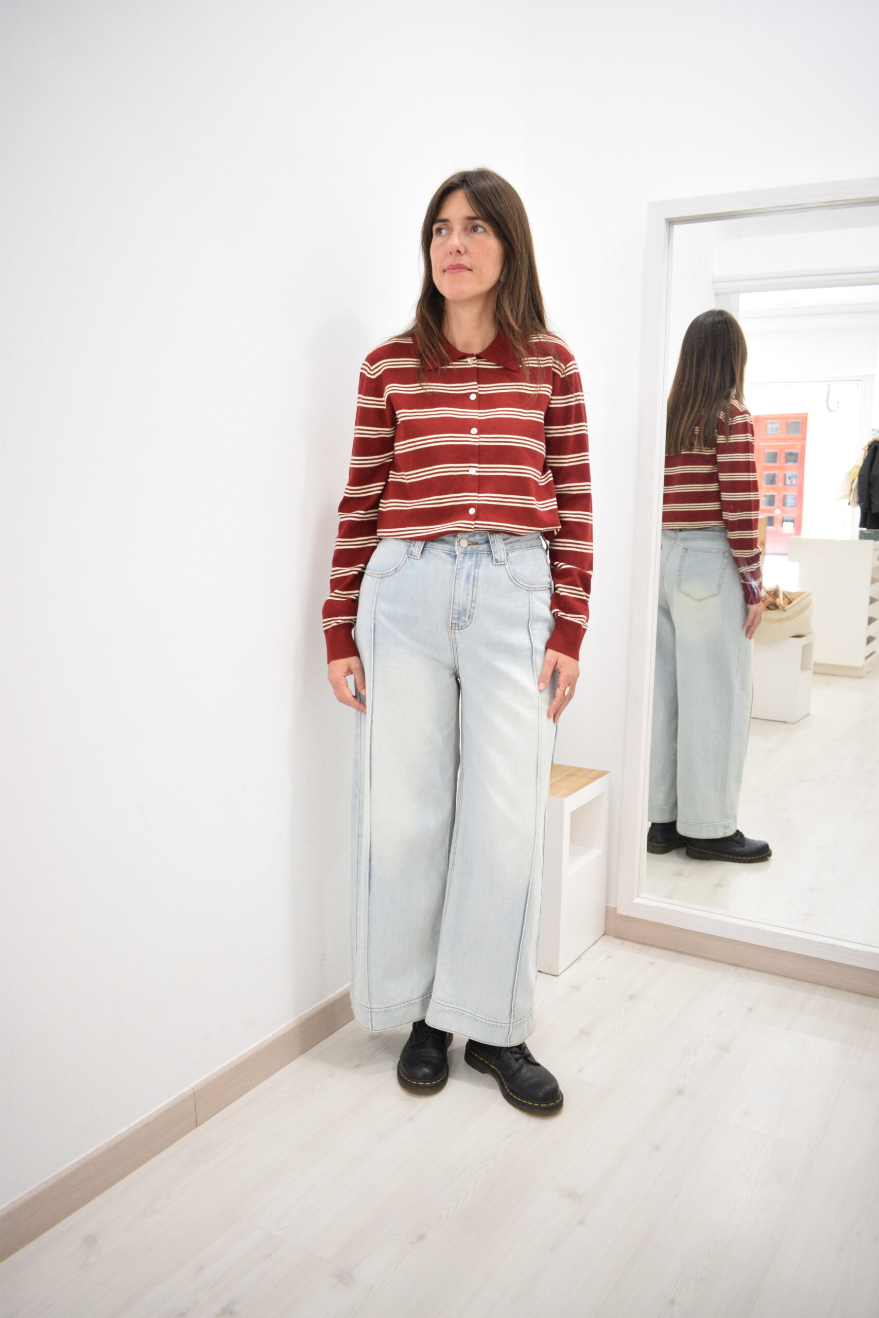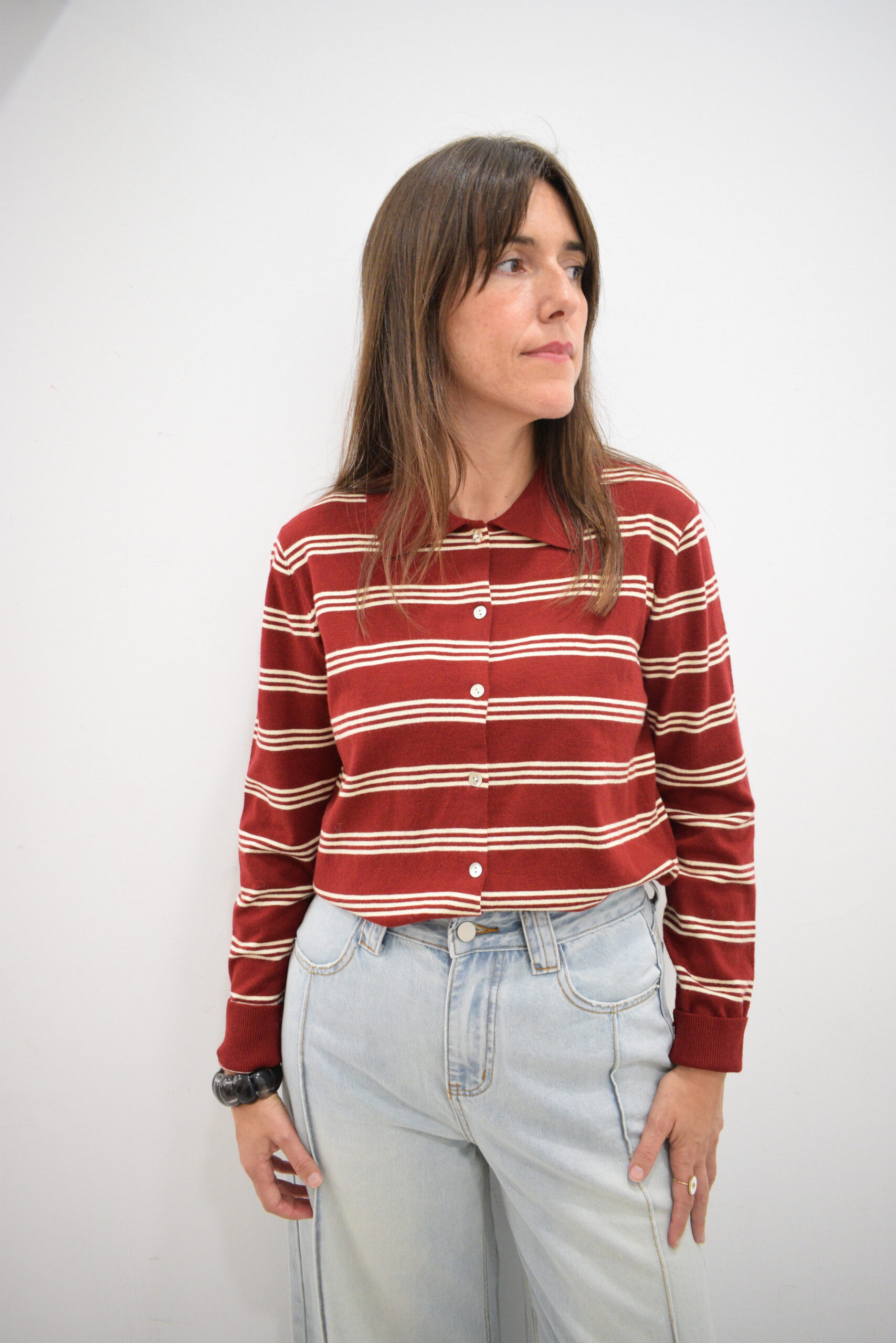Chaqueta a rayas granate Xabat de punto con manga larga y rayas en beige. Cuello granate y botonadura nacarada. Bajo y puños elásticos.