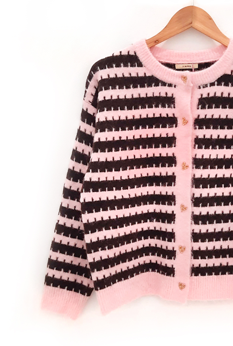 Chaqueta a rayas marrón y rosa Rouss con cuello redondo ribeteado en rosa, puños elásticos y botones dorados con forma de corazón.