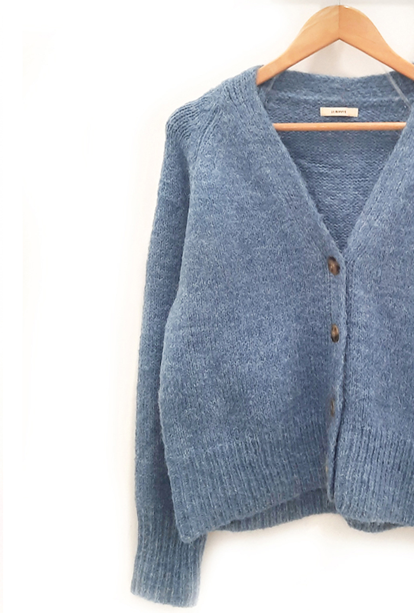 Chaqueta azul Greta de punto con botonera en color marrón claro oscuro, cuello en pico y puños y bajo elásticos.