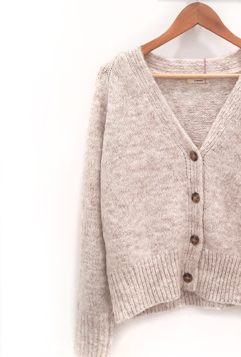 Chaqueta beige Greta de punto con botonera en color marrón claro oscuro, cuello en pico y puños y bajo elásticos.