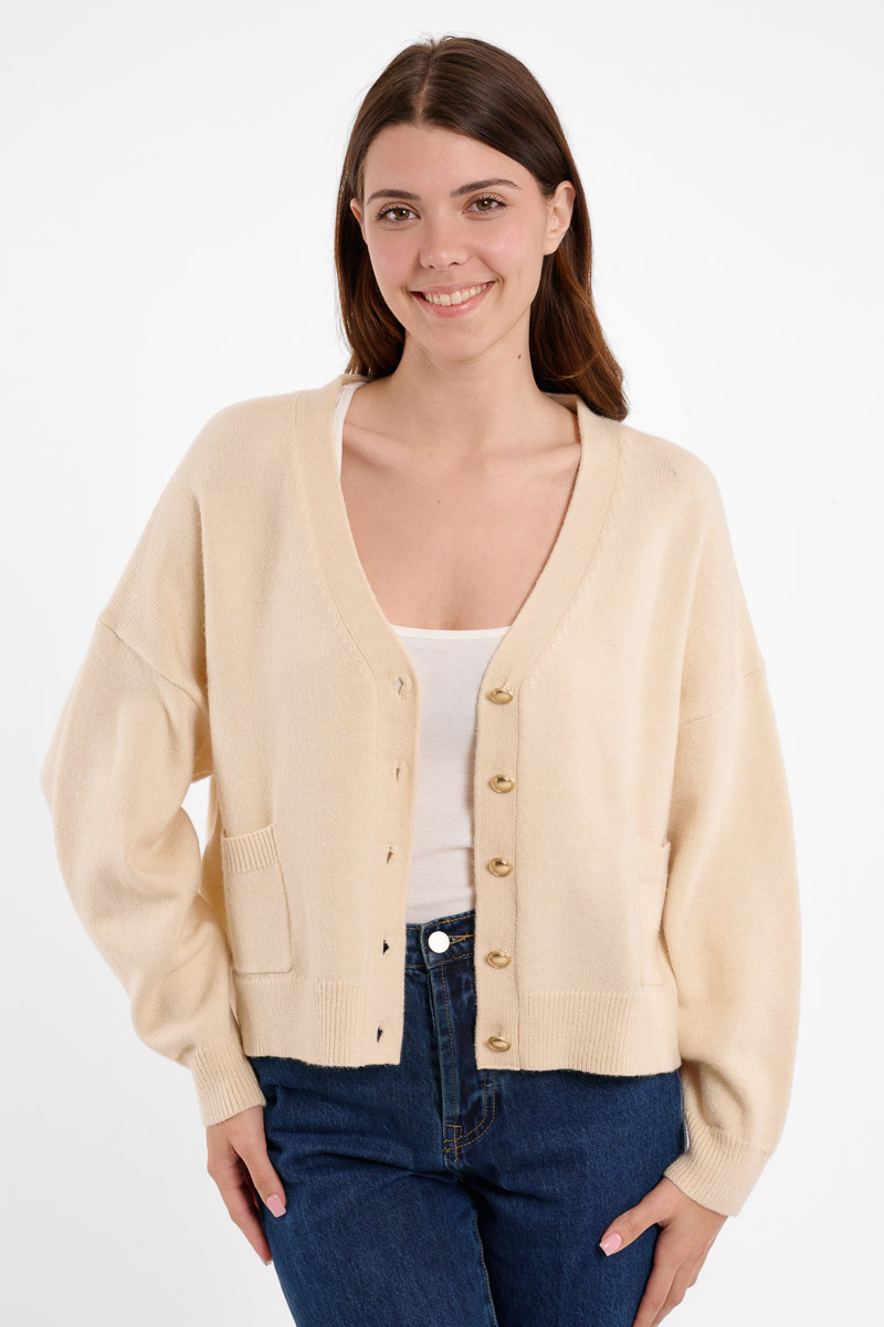 Chaqueta beige de punto y manga larga con botonadura dorada, cuello en pico y dos bolsillos
