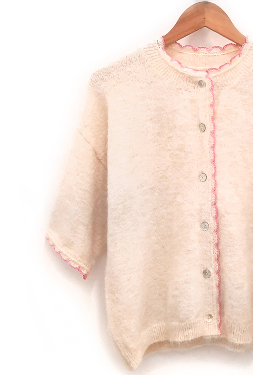 Chaqueta beige y rosa Ter de manga corta, cuello redondo y botonera nacarada, todo ribeteado con ondas de color rosa. Composición: 49% poliéster, 22% poliamida, 15% acrílico, 12% lana y 2% elastano.