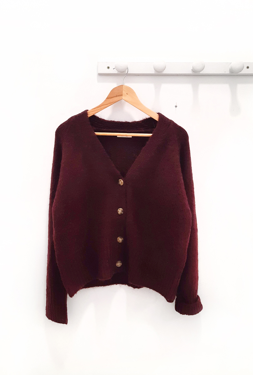 Chaqueta burdeos Greta de punto con botonera en color marrón claro oscuro, cuello en pico y puños y bajo elásticos.