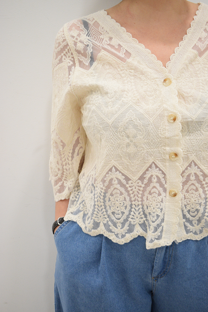 Blusa calada beige Luara con escote en pico, manga media y botonera marrón claro oscuro. Composición: 65% algodón y 35% poliéster-