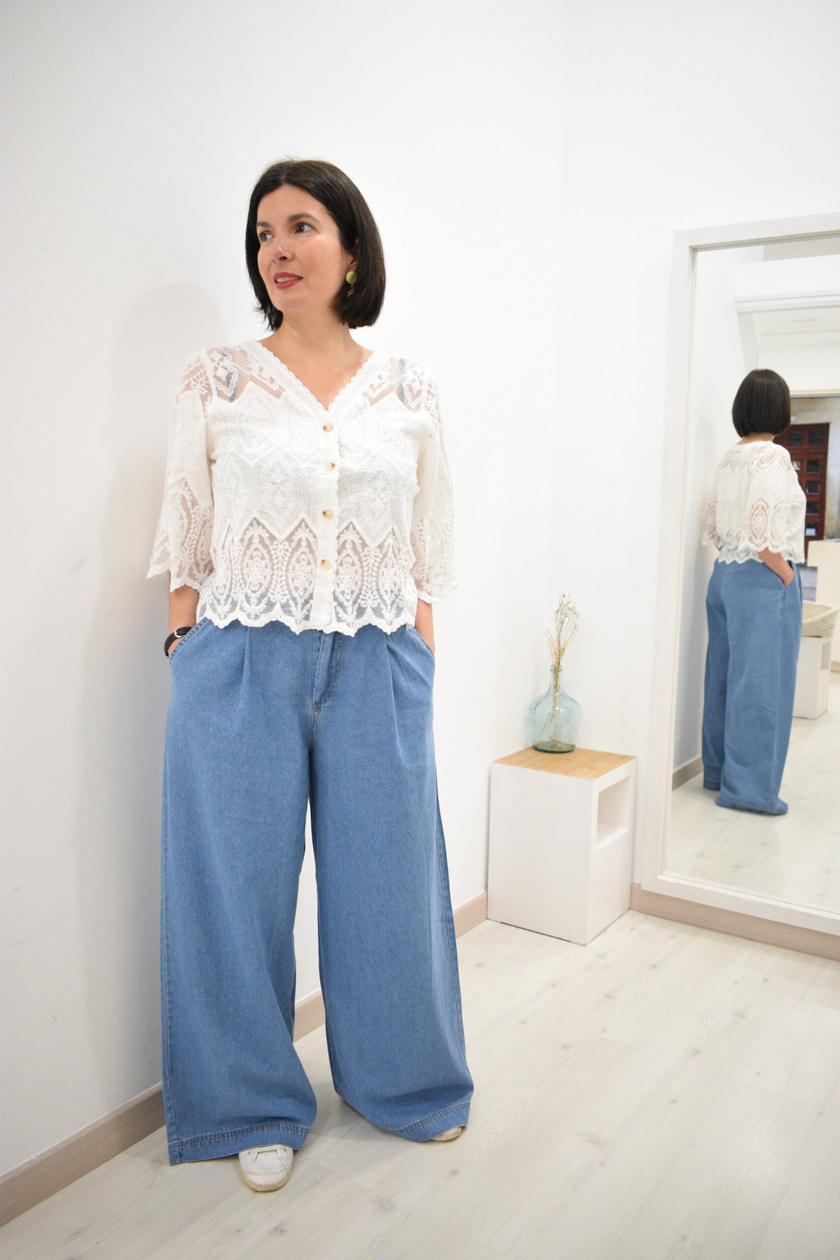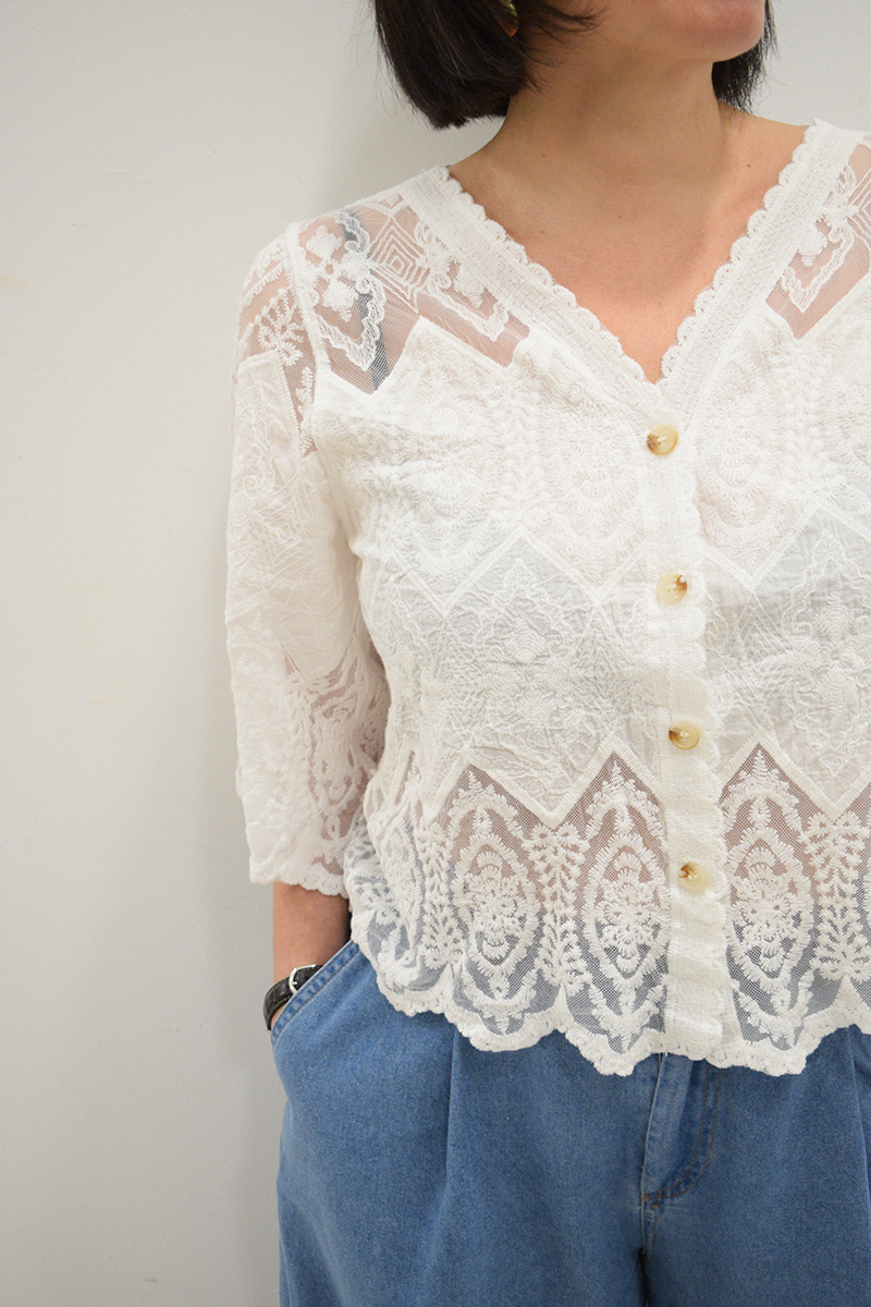 Blusa calada blanca Luara con escote en pico, manga media y botonera marrón claro oscuro. Composición: 65% algodón y 35% poliéster-