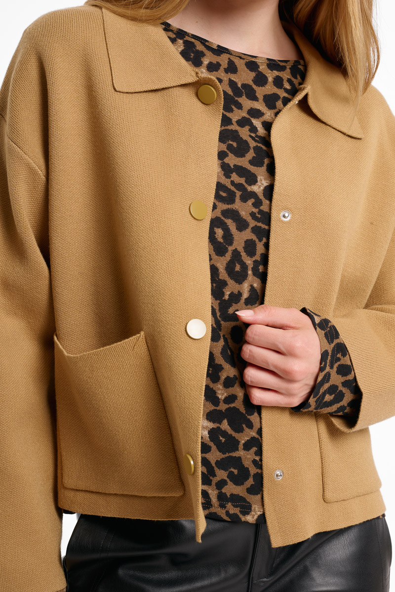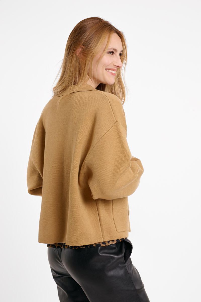 Chaqueta camel Luan con cuello y botonadura del mismo color. Bolsillos en la parte delantera.