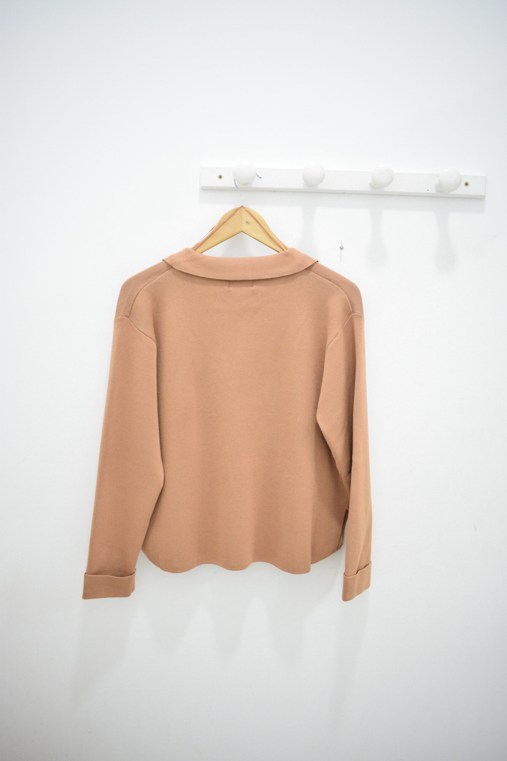 Chaqueta de punto fino color marrón clarito con botones a tono y bolsillos en el pecho.
