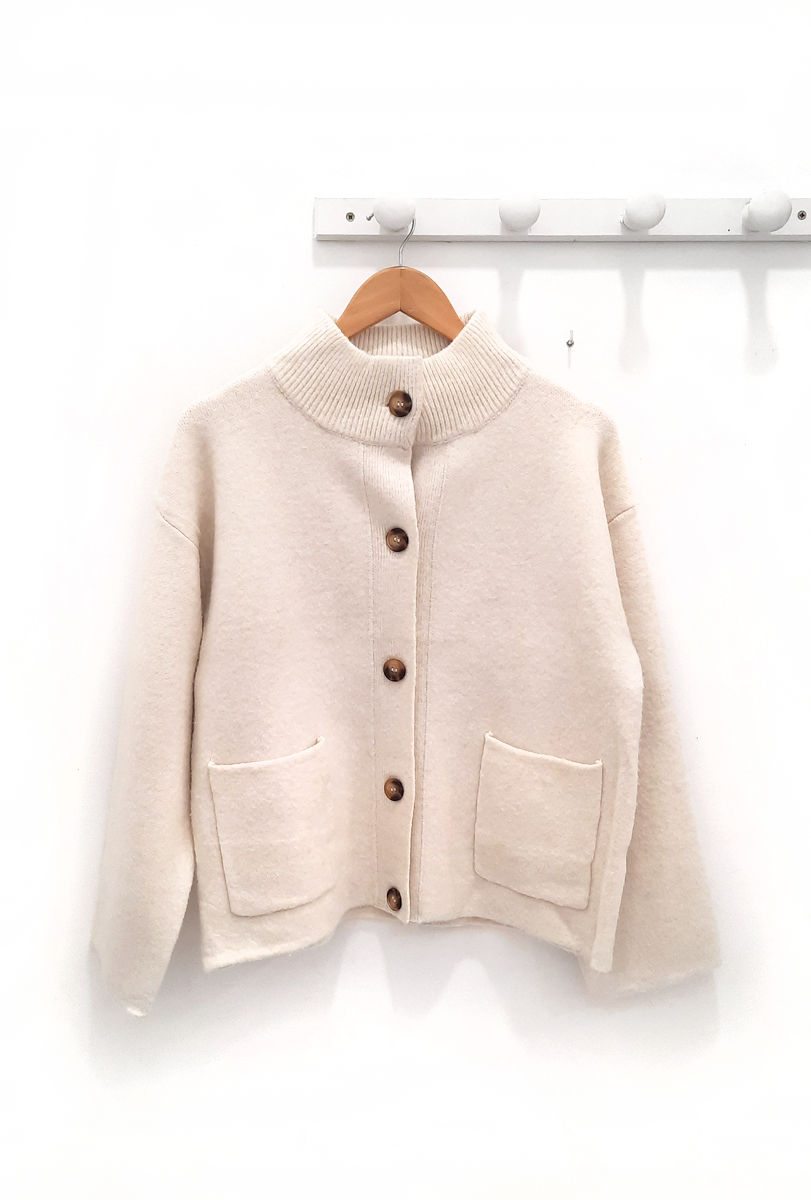 Chaqueta crudo Nuria depunto muy tupido con botonera en color marrón claro oscuro, cuello elastico alto y bolsillos cuadrados frontales.