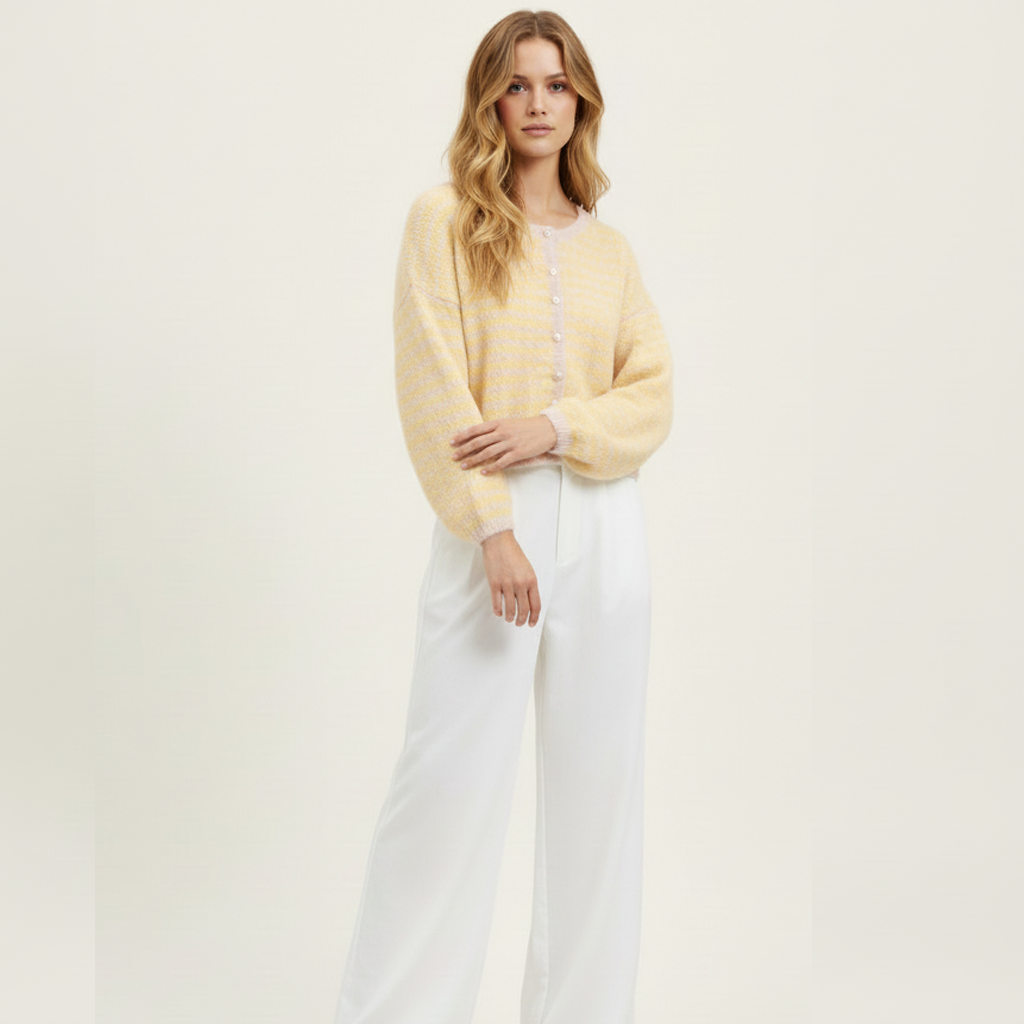 Chaqueta de punto amarilla Bianca con cuello redondo simple, botones nacarados de media esfera y puños elásticos. Estampado de rayas irregulares amarillas y blancas y ribete blanco en cuello, botonadura, bajo y puños.