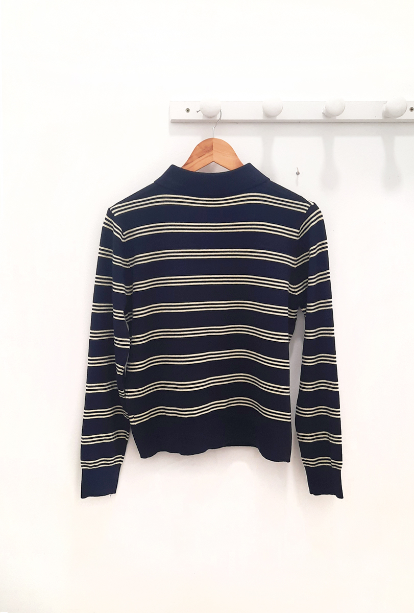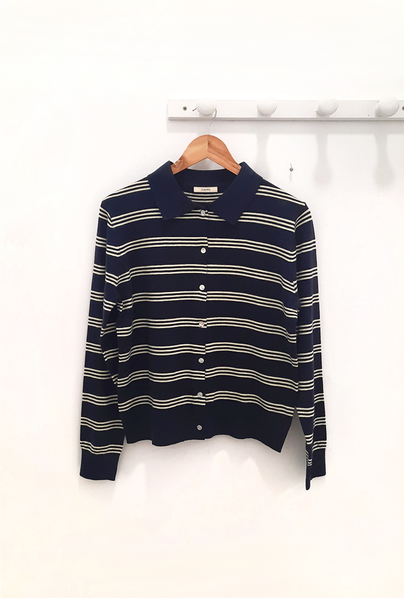 Jersey de rayas azul marino Xabat de punto con manga larga, cuello azul marino y botonadura nácar.