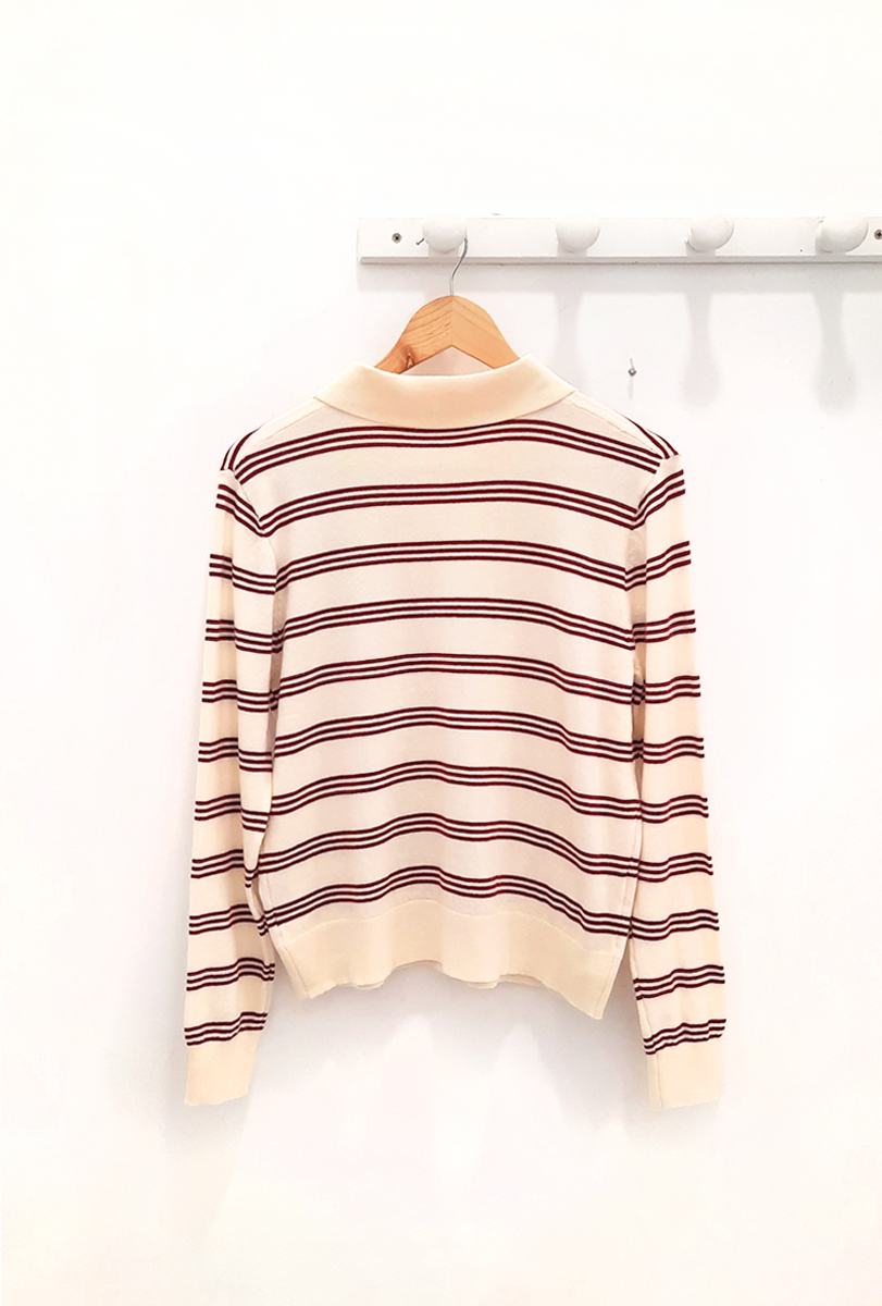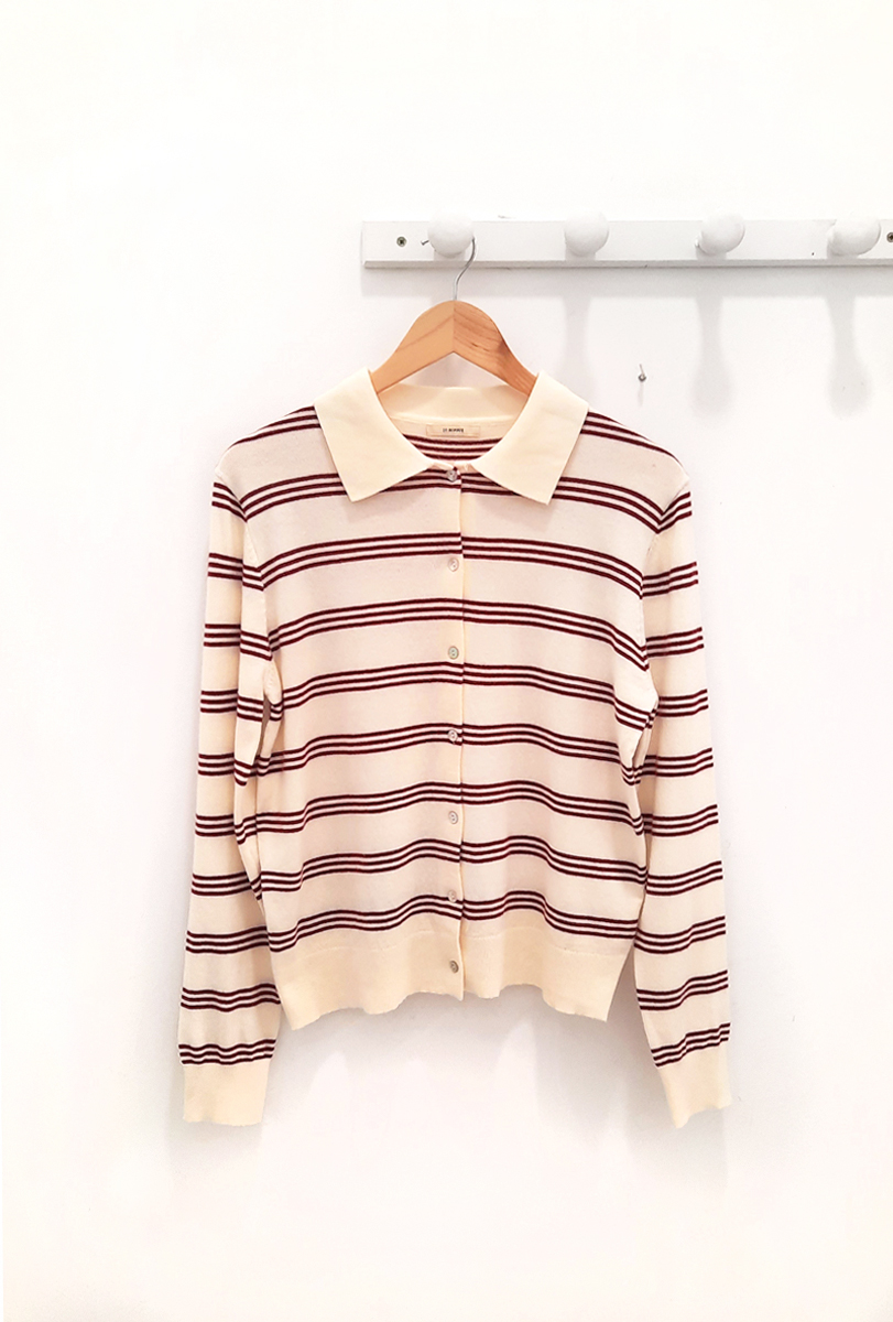 Jersey de rayas cruda Xabat de punto con manga larga, cuello crudo y botonadura nácar.