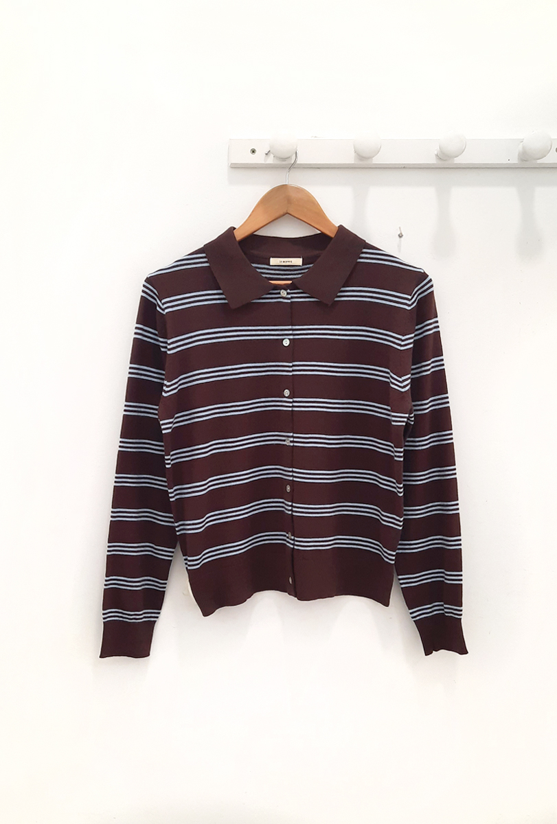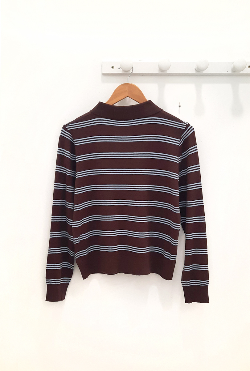 Jersey de rayas azul marrón Xabat de punto con manga larga, cuello marrón y botonadura nácar.