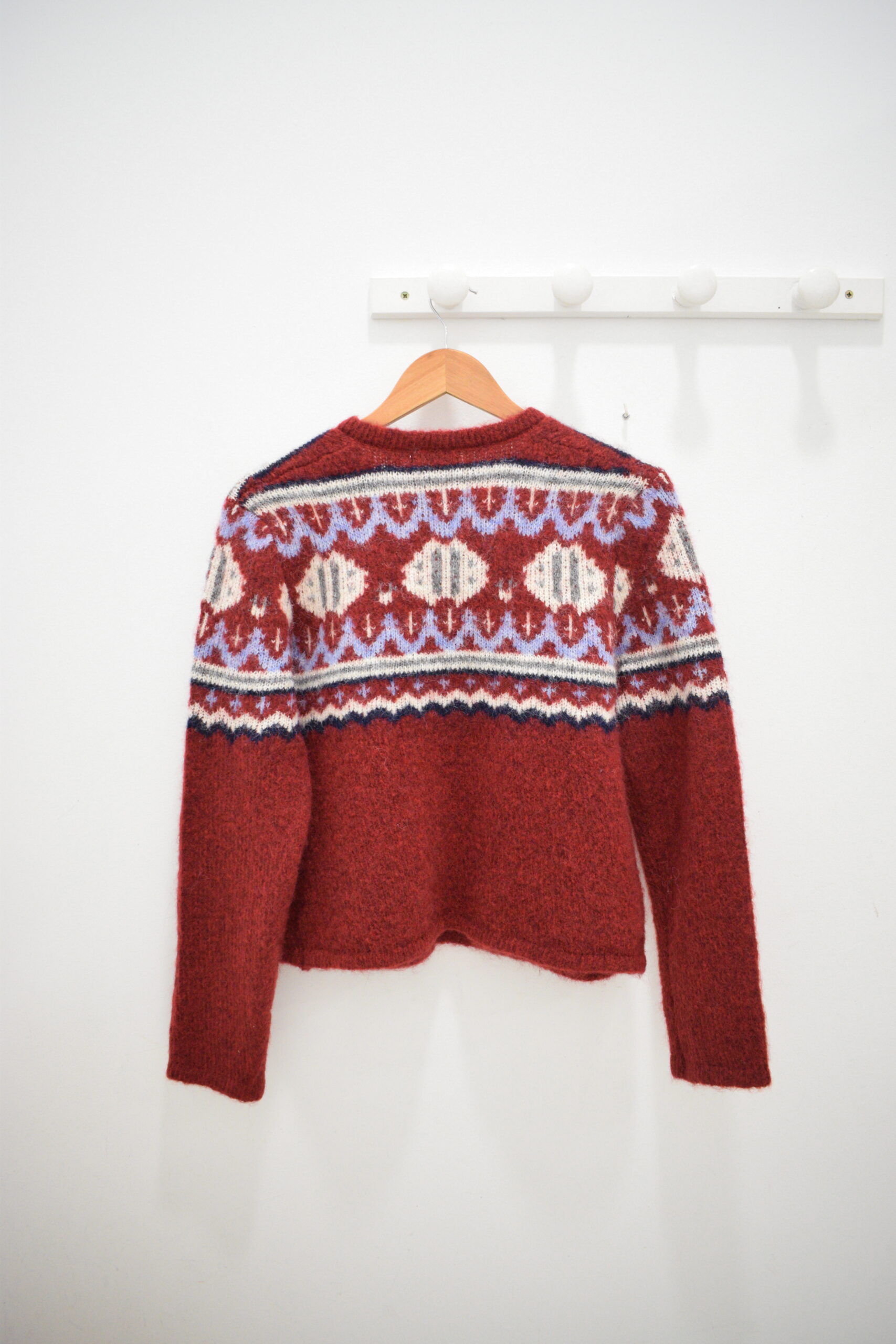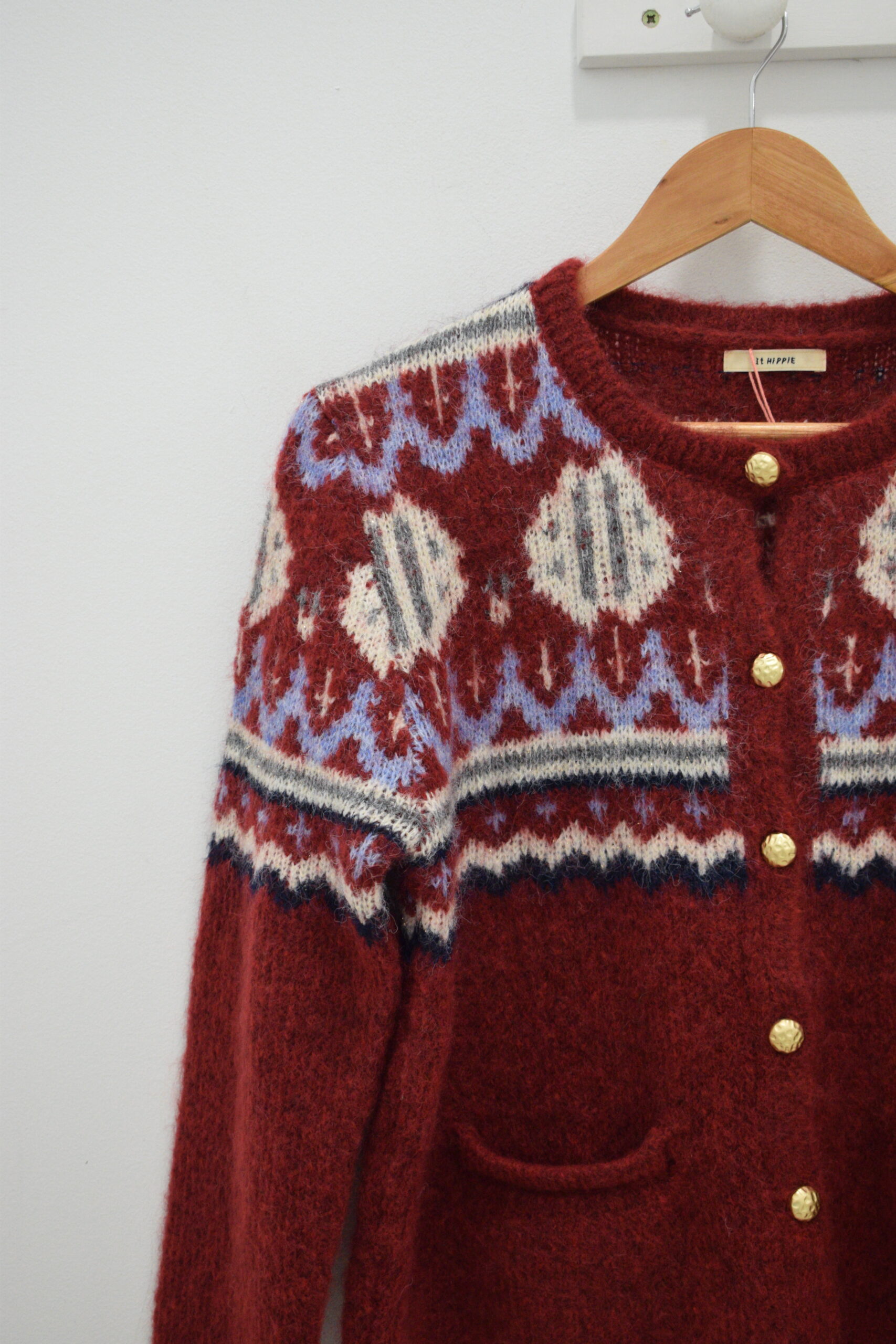 Chaqueta granate con estampado en tonos crudo, gris y azul, botones dorados y bolsillos frontales.