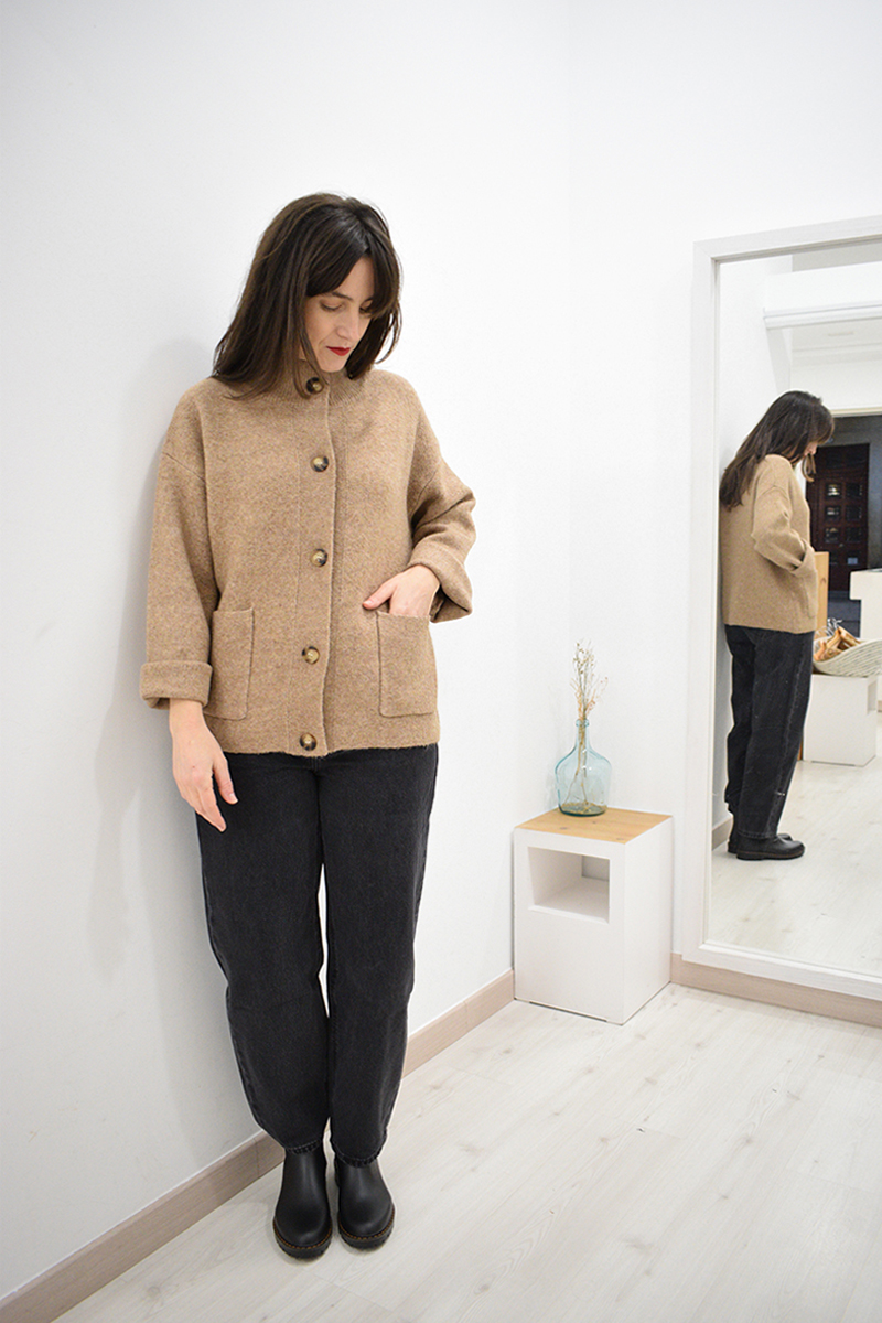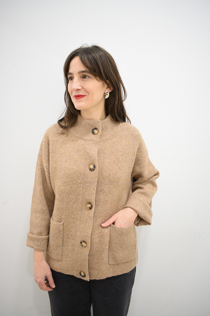 Chaqueta marrón Nuria de punto muy tupido con botonera en color marrón claro oscuro, cuello elástico alto y bolsillos cuadrados frontales.