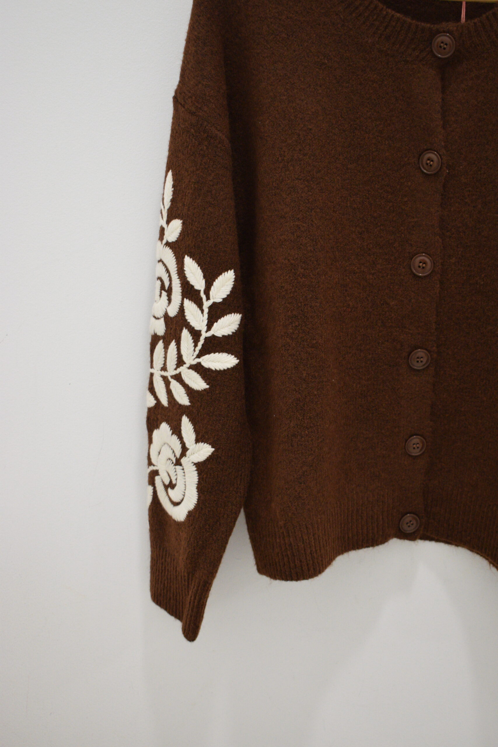 Chaqueta marrón de punto con bordado floral crudo en mangas, botones a tono cuello redondo y puños elásticos.