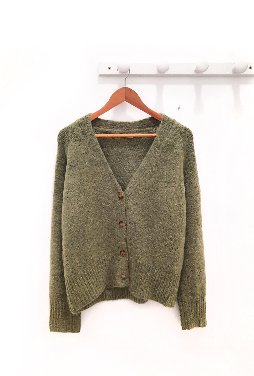 Chaqueta verde Greta de punto con botonera en color marrón claro oscuro, cuello en pico y puños y bajo elásticos.