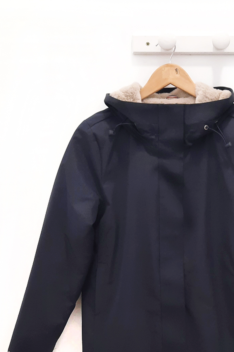 Chubasquero azul marino Caspian de largura media con capucha ajustable, cierre con cremallera y solapa, dos bolsillos verticales con cremallera, forro interior de pelo beige y puños ajustables con botón de clic. Tejido impermeable y cortavientos.