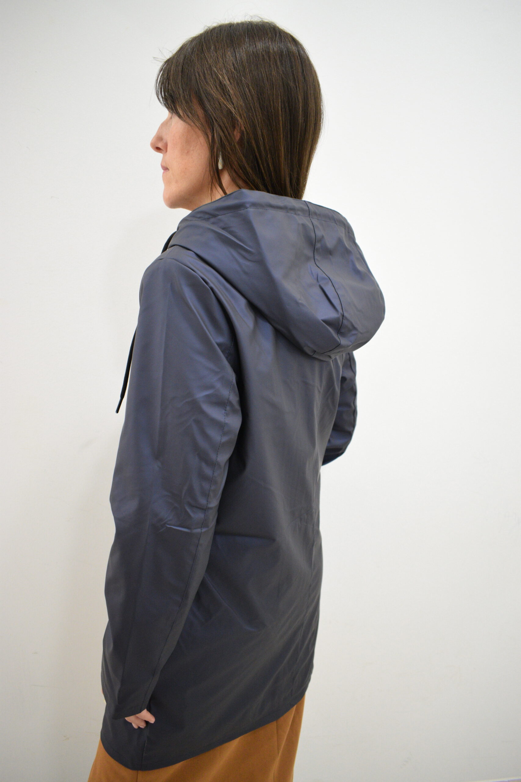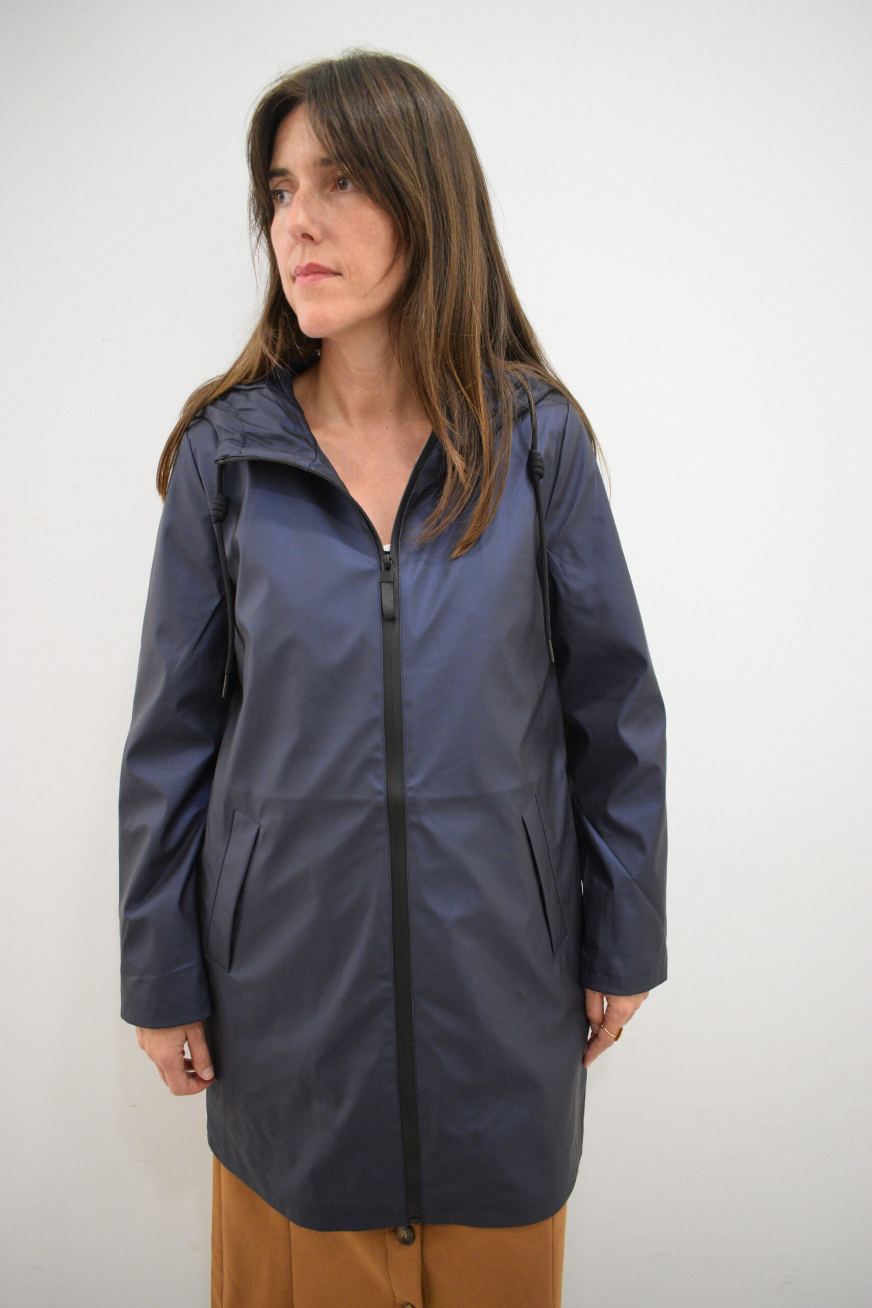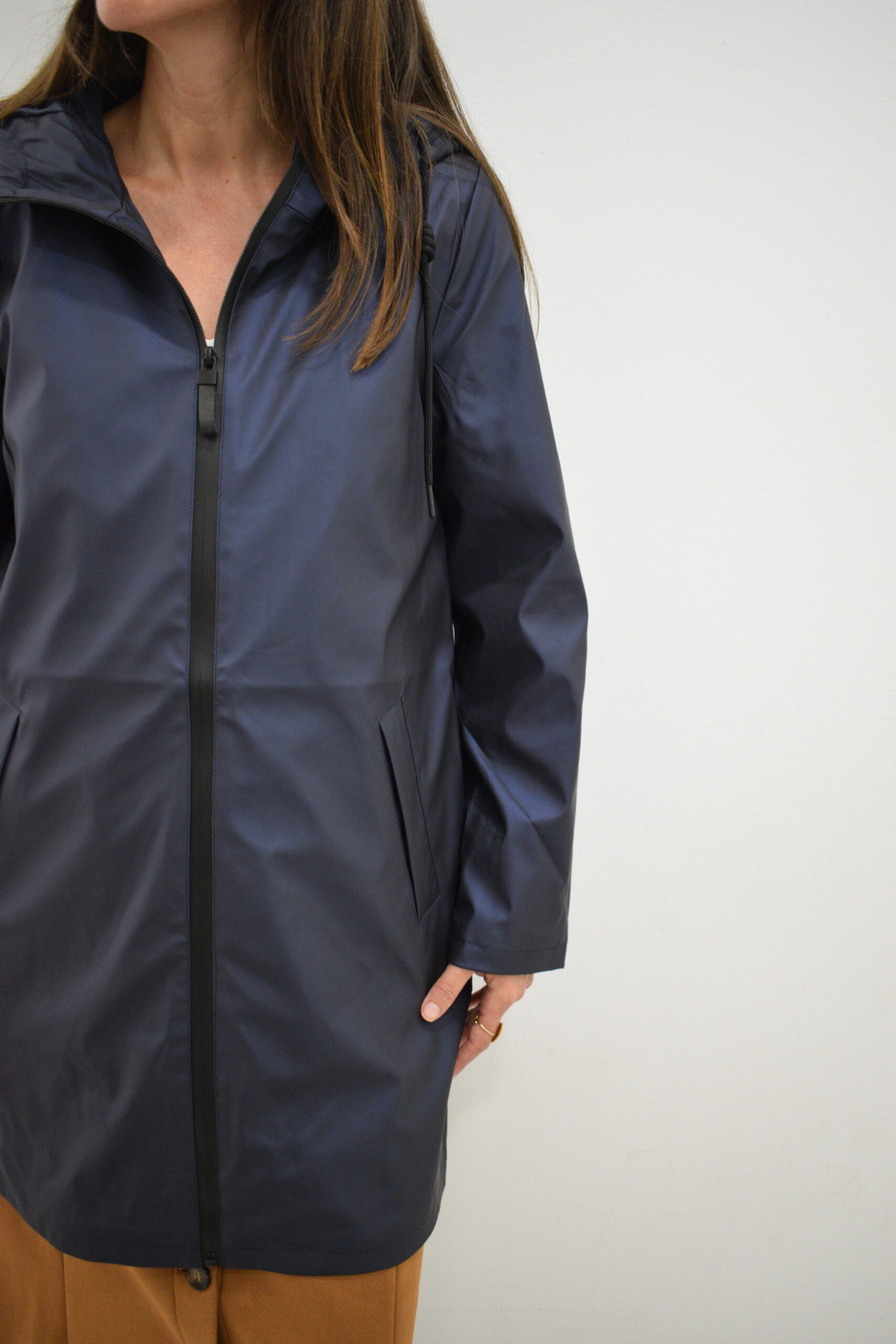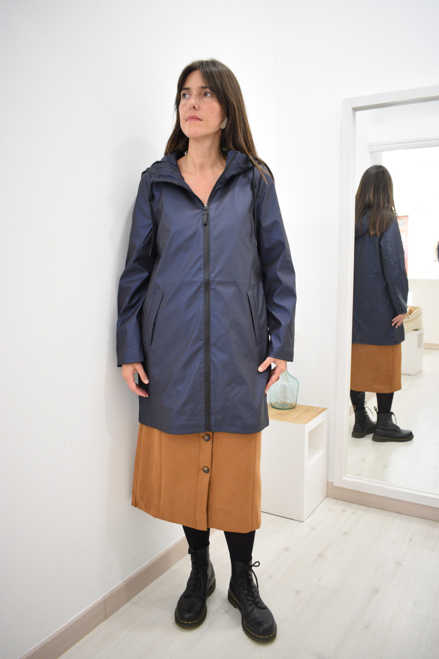 Chubasquero de largura media en color azul marino con ligero brillo, capucha ajustable, bolsillos sin cierre, cremallera negra y forro interior a tono. Tejido impermeablle y cortavientos.