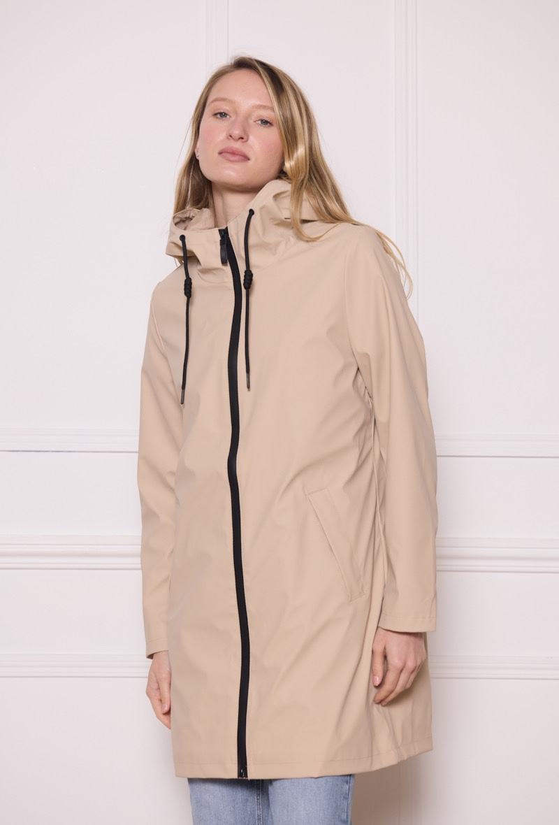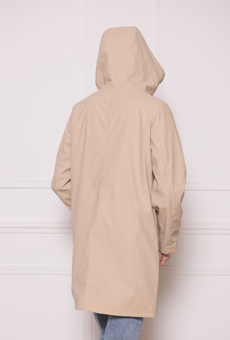 Chubasquero beige Ura de largura media con capucha ajustable, bolsillos en diagonal sin cierre, cremallera negra y forro interior a tono. Tejido impermeable y cortavientos.