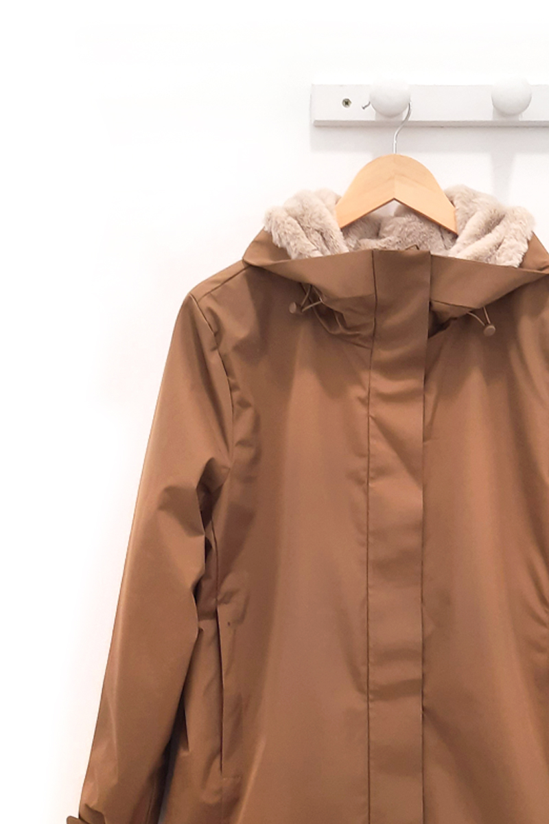 Chubasquero camel Caspian de largura media con capucha ajustable, cierre con cremallera y solapa, dos bolsillos verticales con cremallera, forro interior de pelo beige y puños ajustables con botón de clic. Tejido impermeable y cortavientos.