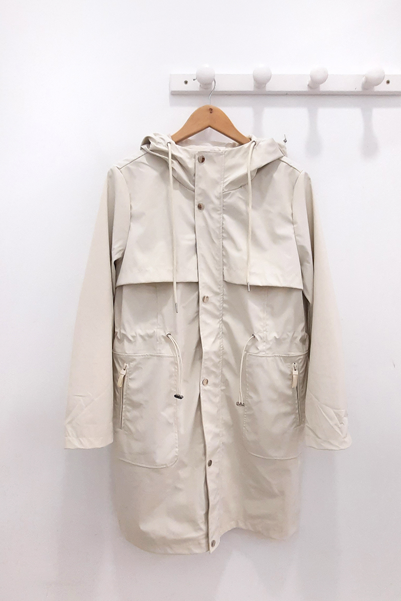 Chubasquero crudo Kazkabar de largura media con capucha ajustable, cierre de cremallera y botonadura en tono metálico de clicks, bolsillos laterales y cintura elástica con goma ajustable. Tejido impermeable y cortavientos.