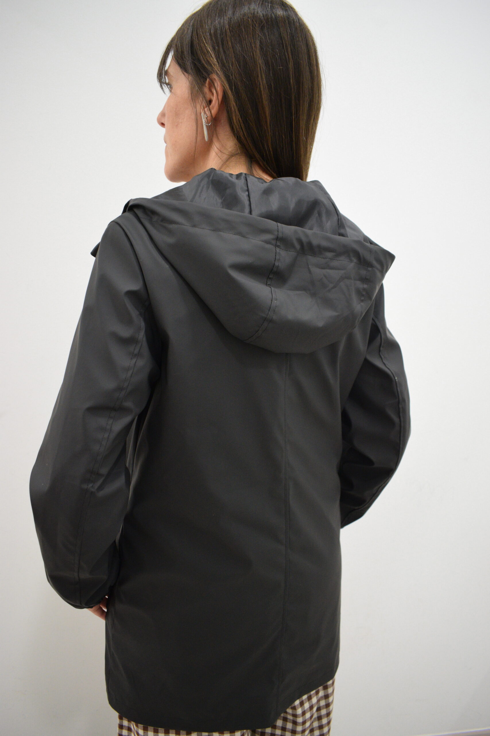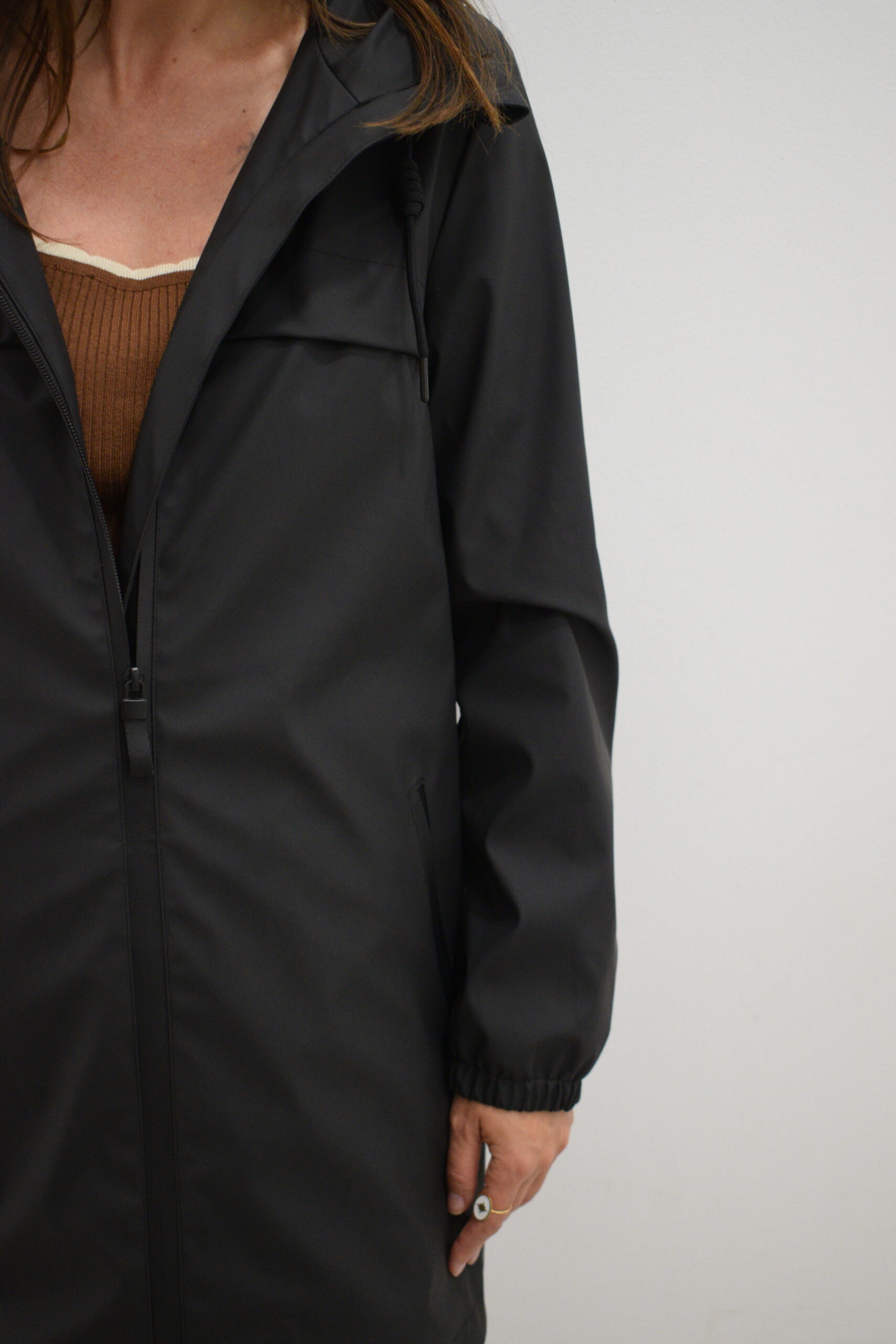 Chubasquero de largura media negro Enbata con capucha ajustable, bolsillos con cremallera y forro interior del mismo tono. Tejido impermeable y cortavientos.