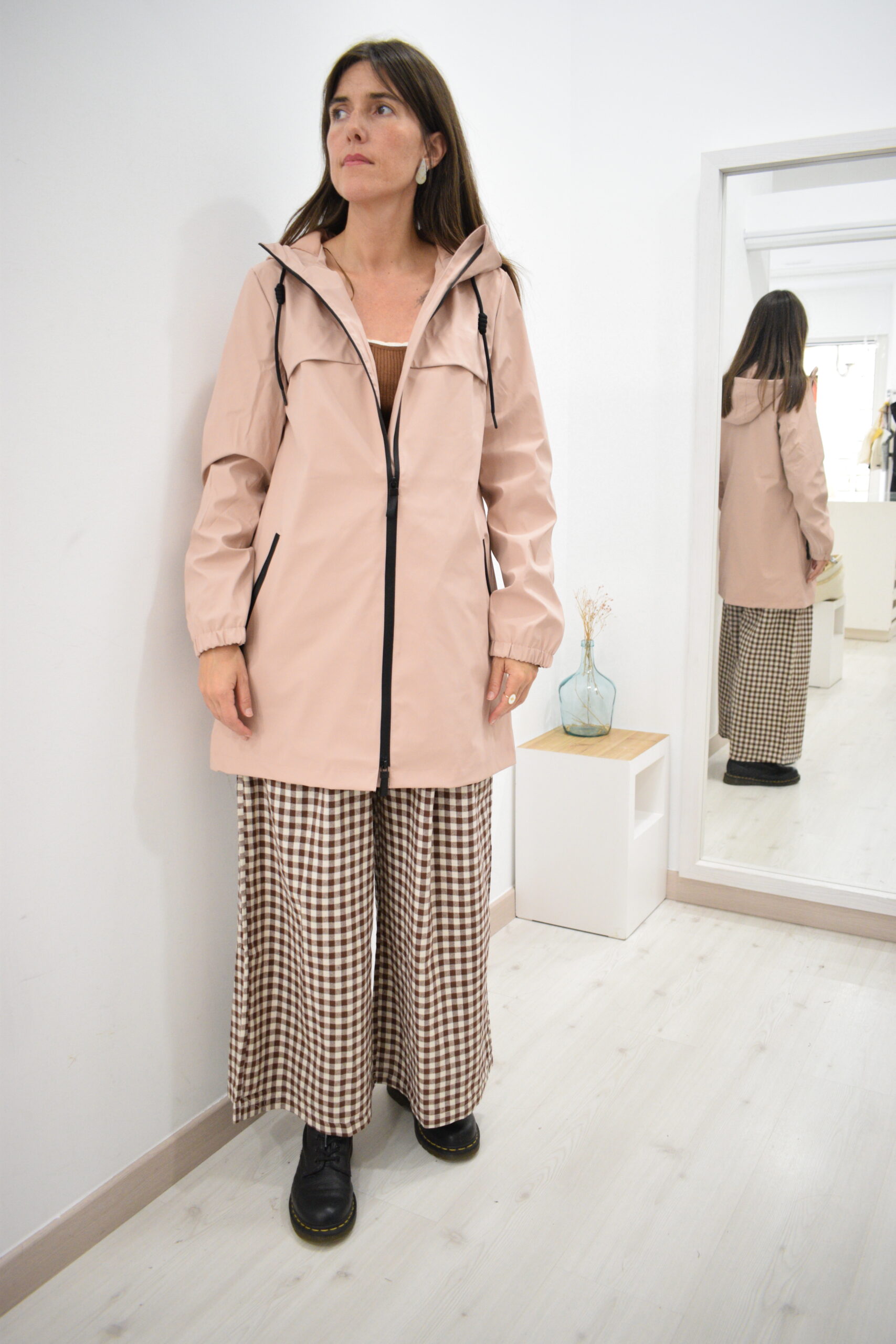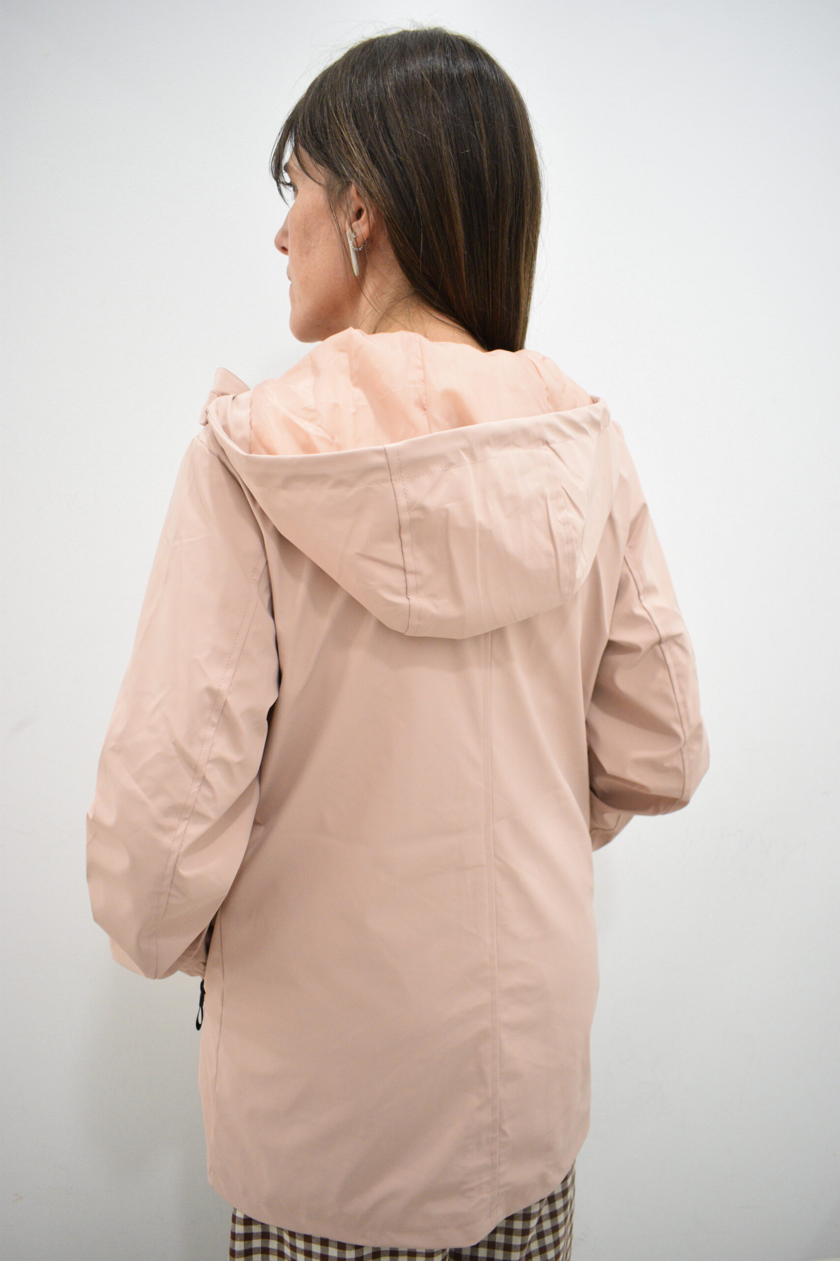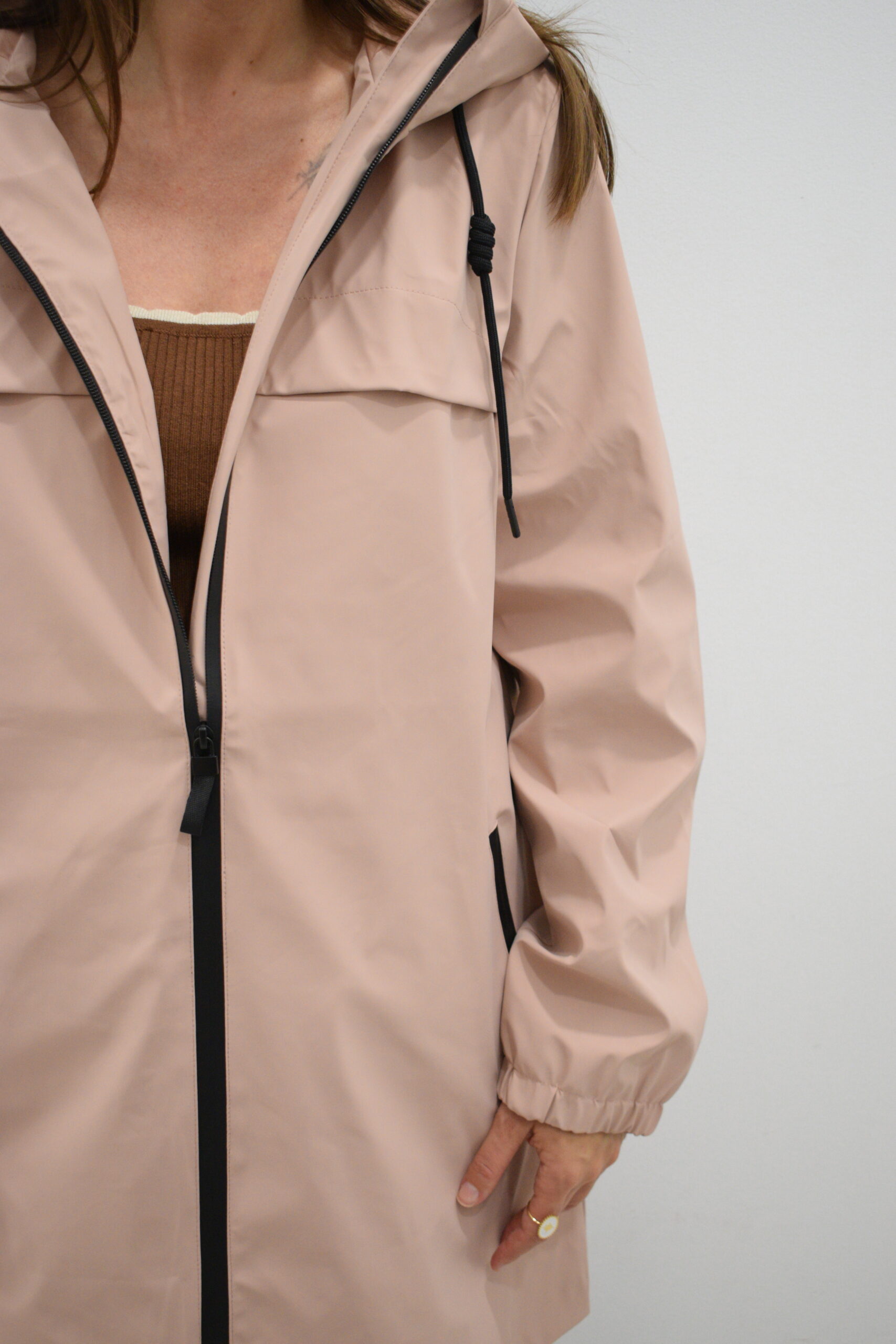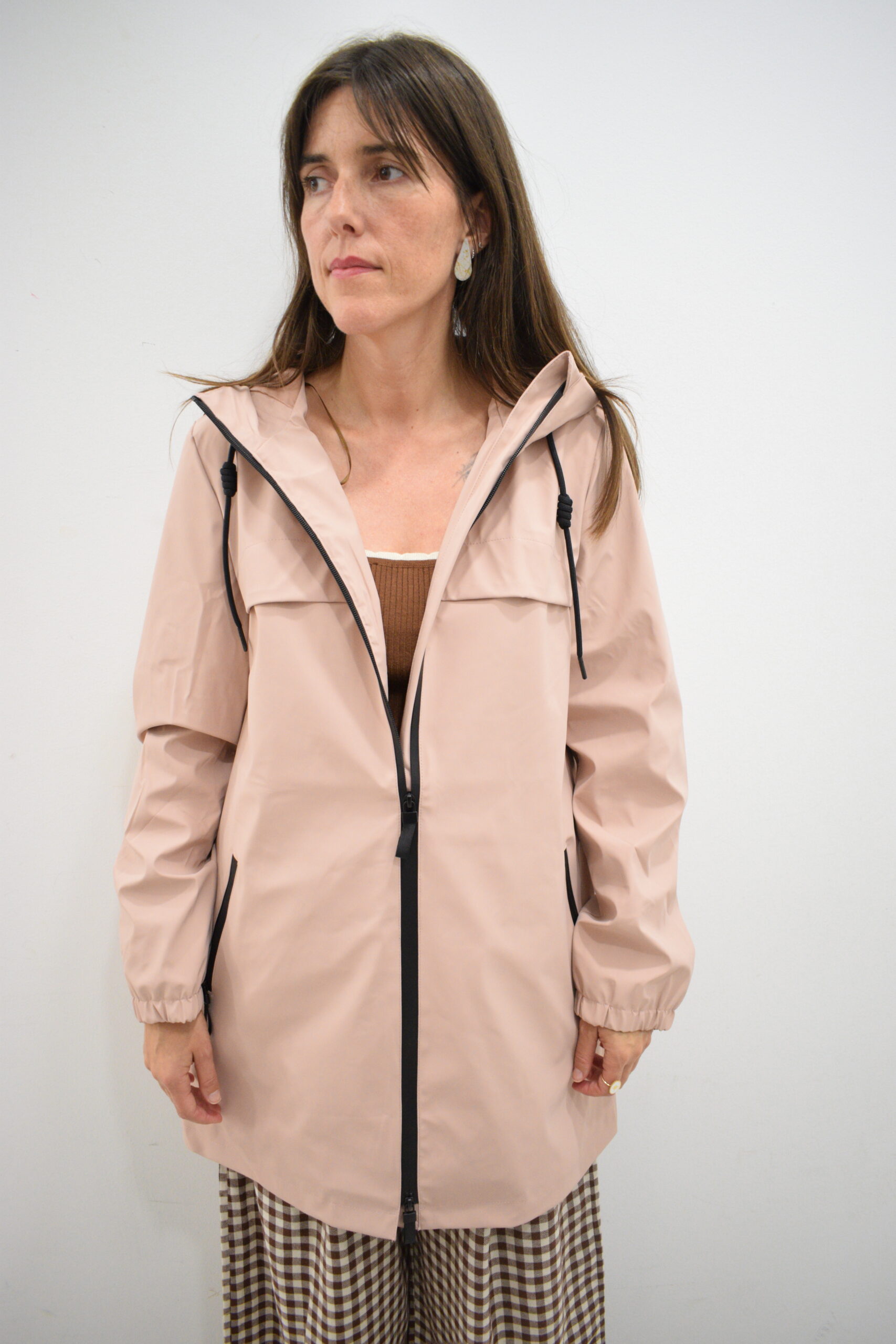 Chubasquero de largura media rosa palo Enbata con capucha ajustable, bolsillos con cremallera y forro interior del mismo tono. Tejido impermeable y cortavientos.