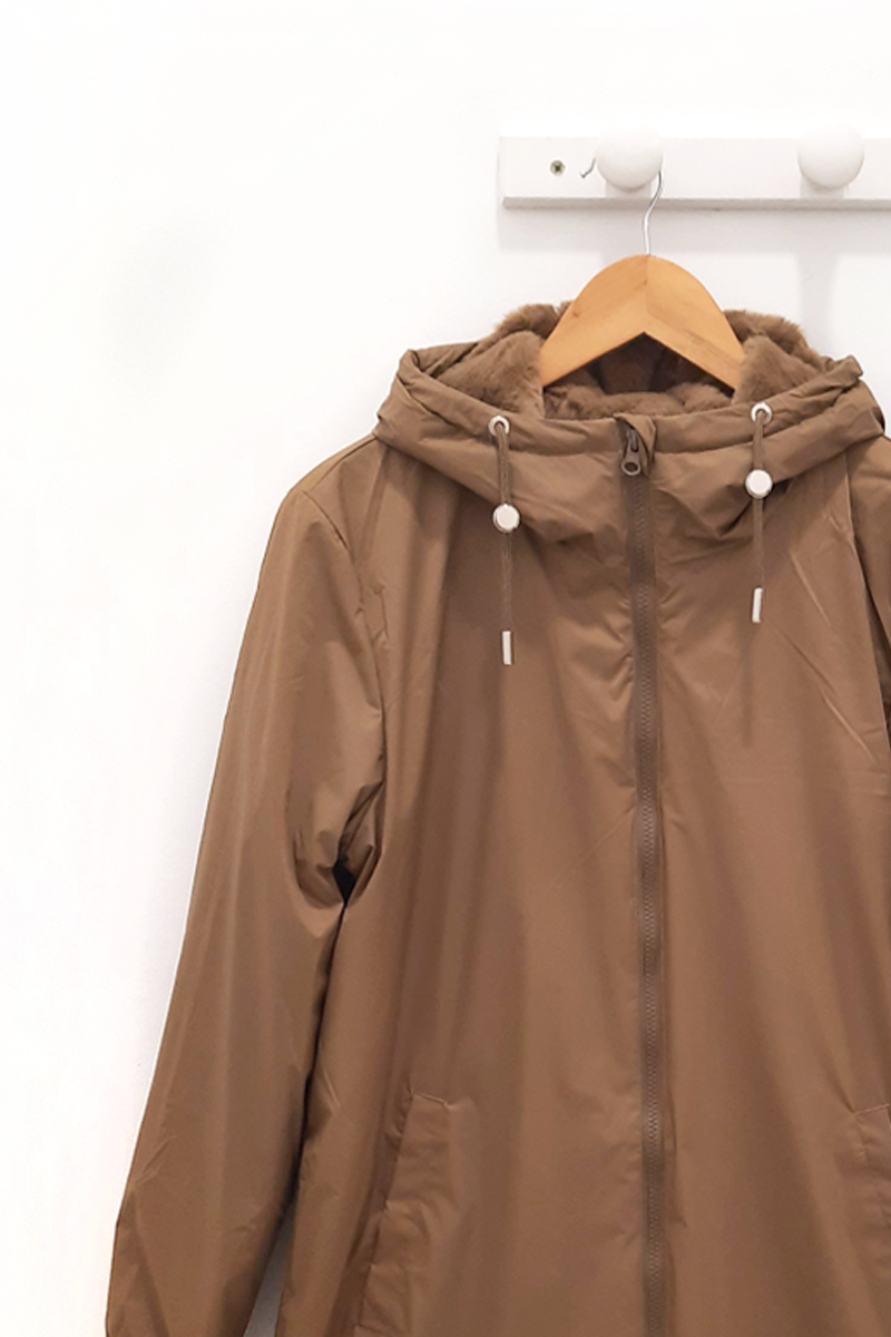 Chubasquero marrón verdoso Tanta de largura media con capucha ajustable con detalles en tono plateado, cierre con cremallera, dos bolsillos verticales con botón central de clic, forro interior de pelo en el mismo tono y puños elásticos. Tejido impermeable y cortavientos.