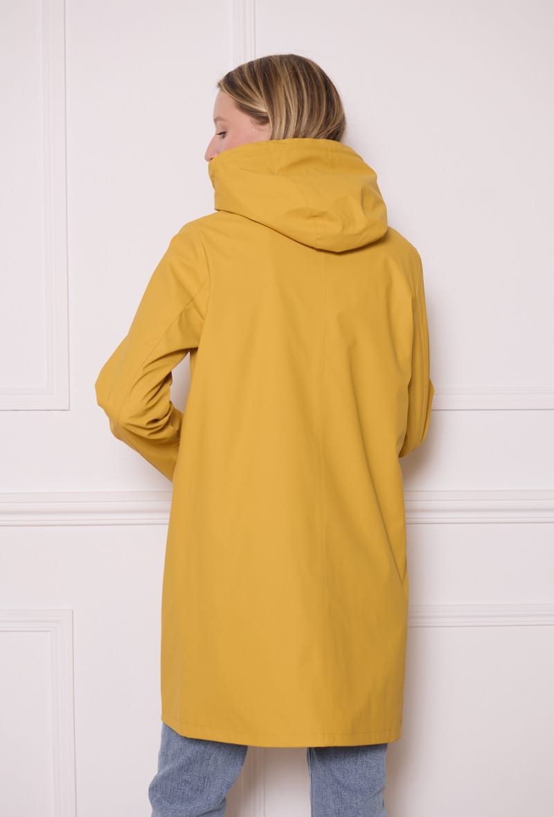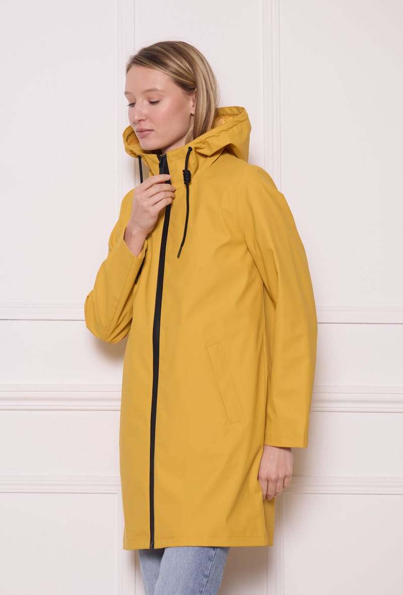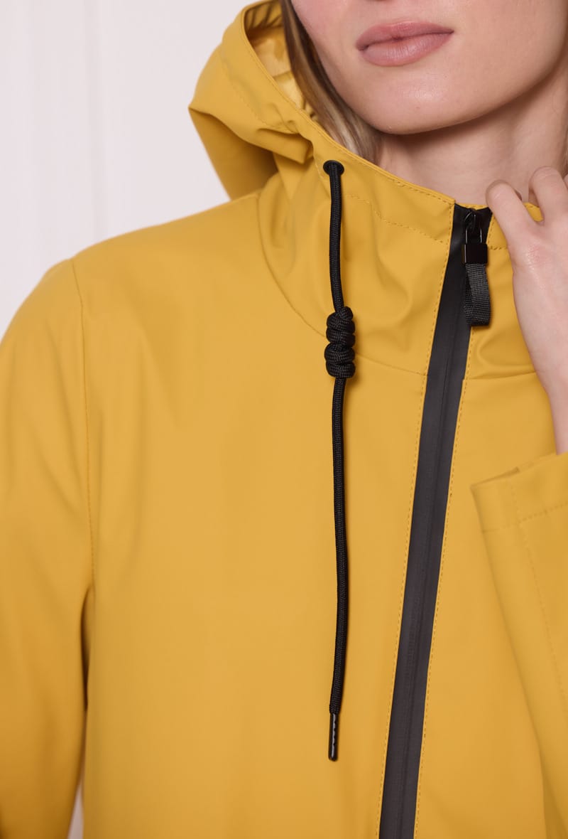 Chubasquero mostaza Ura de largura media con capucha ajustable, bolsillos en diagonal sin cierre, cremallera negra y forro interior a tono. Tejido impermeable y cortavientos.