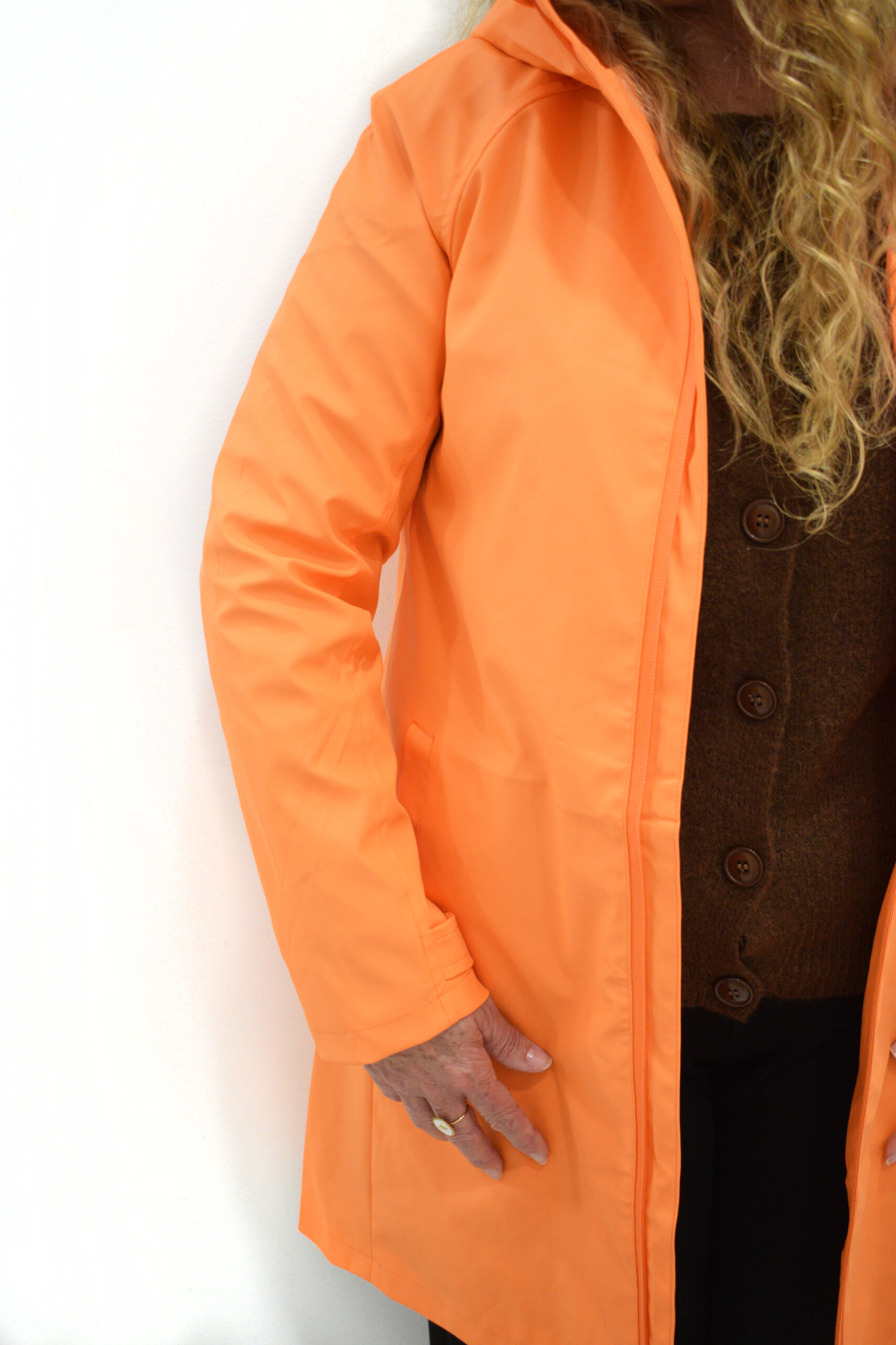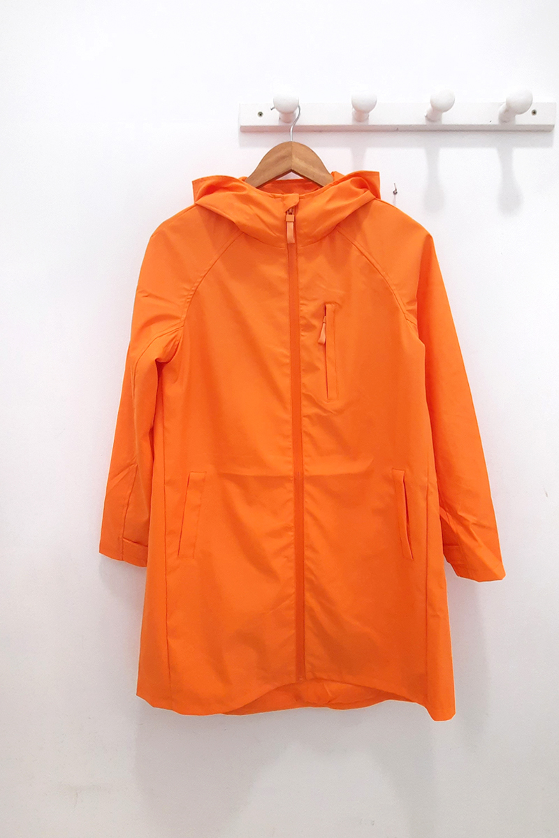 Chubasquero naranja Trumoi con capucha ajustable, cierre de cremallera frontal, bolsillo frontal a la altura del pecho y bolsillos laterales y forro interior a tono. Tejido impermeable y cortavientos.