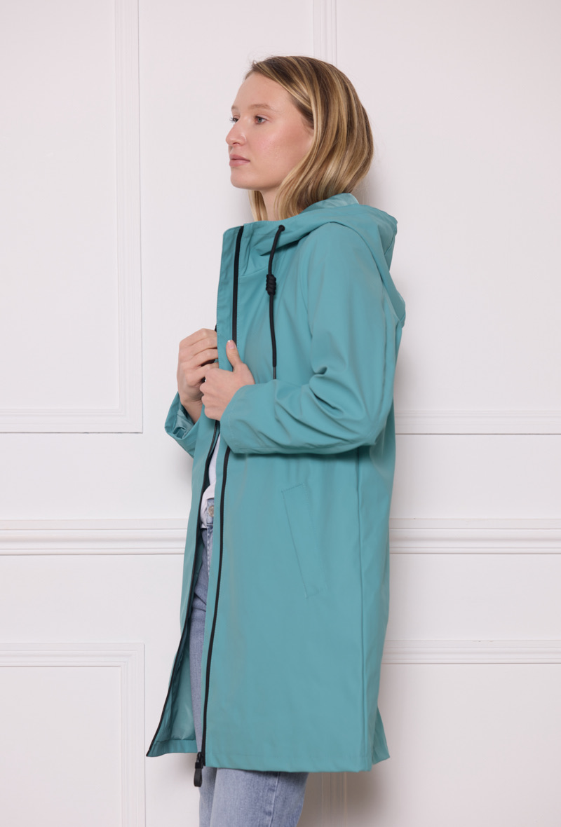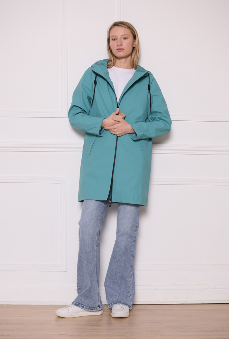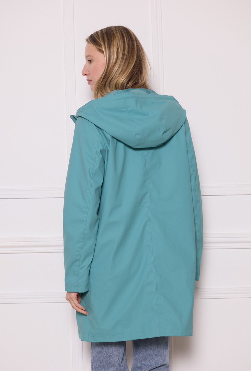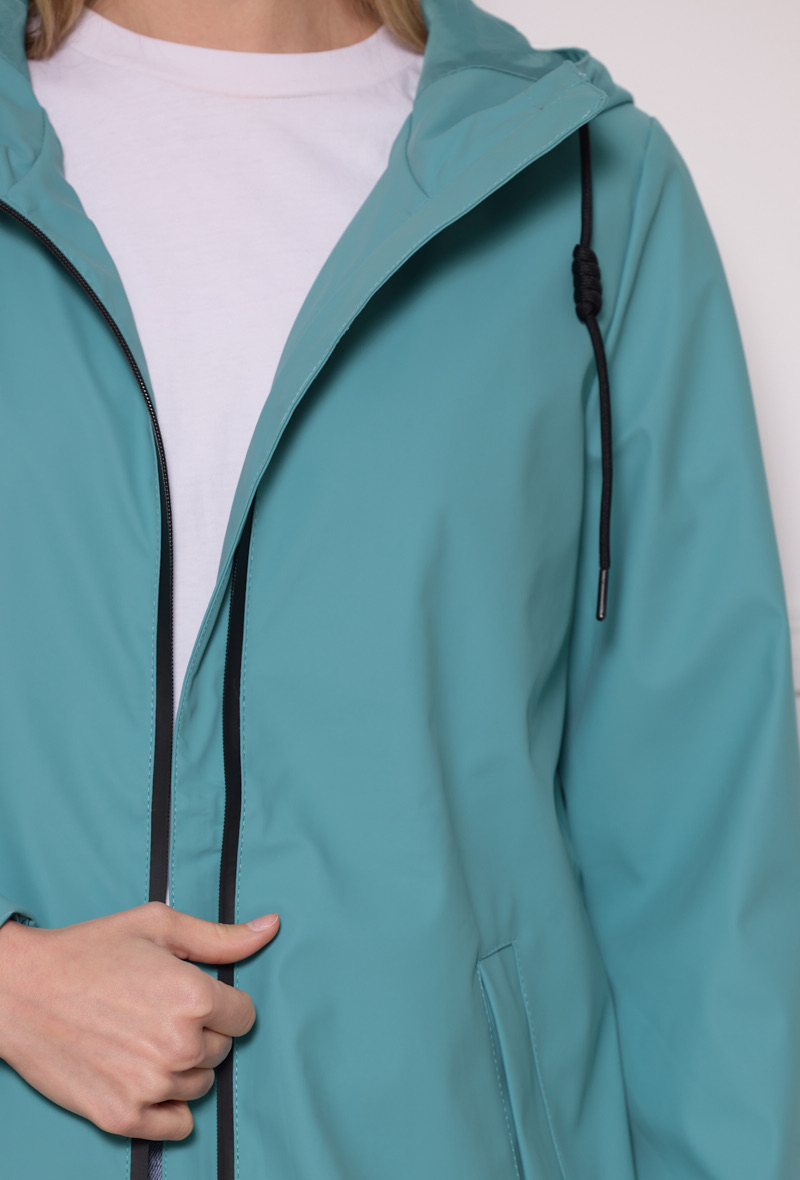 Chubasquero turquesa Ura de largura media con capucha ajustable, bolsillos en diagonal sin cierre, cremallera negra y forro interior a tono. Tejido impermeable y cortavientos. Composición: 52% Poliuretano 48% Poliester. Forro: 100% Poliester.
