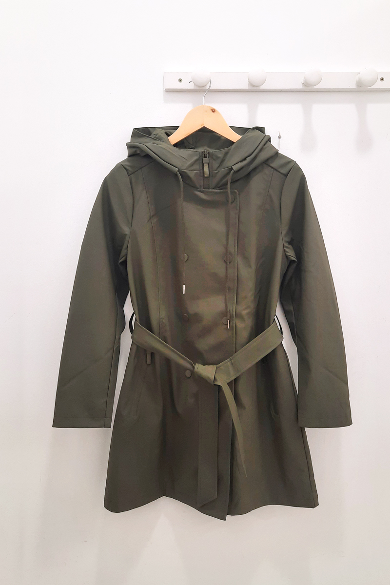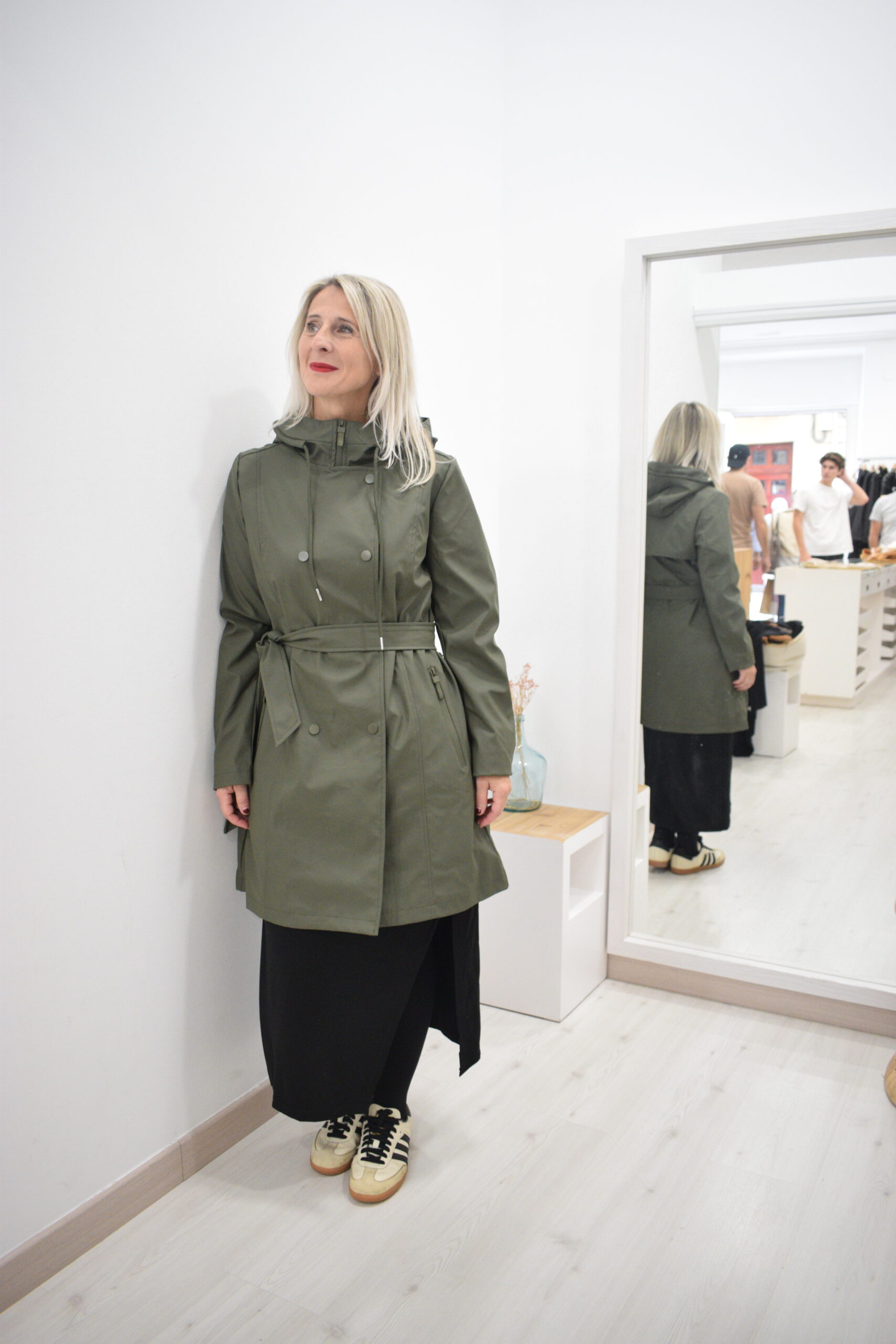 Chubasquero caqui Xirimiri de largura media con capucha ajustable, cierre de cremallera y botonadura, bolsillos laterales y cinturón regulable efecto gabardina.