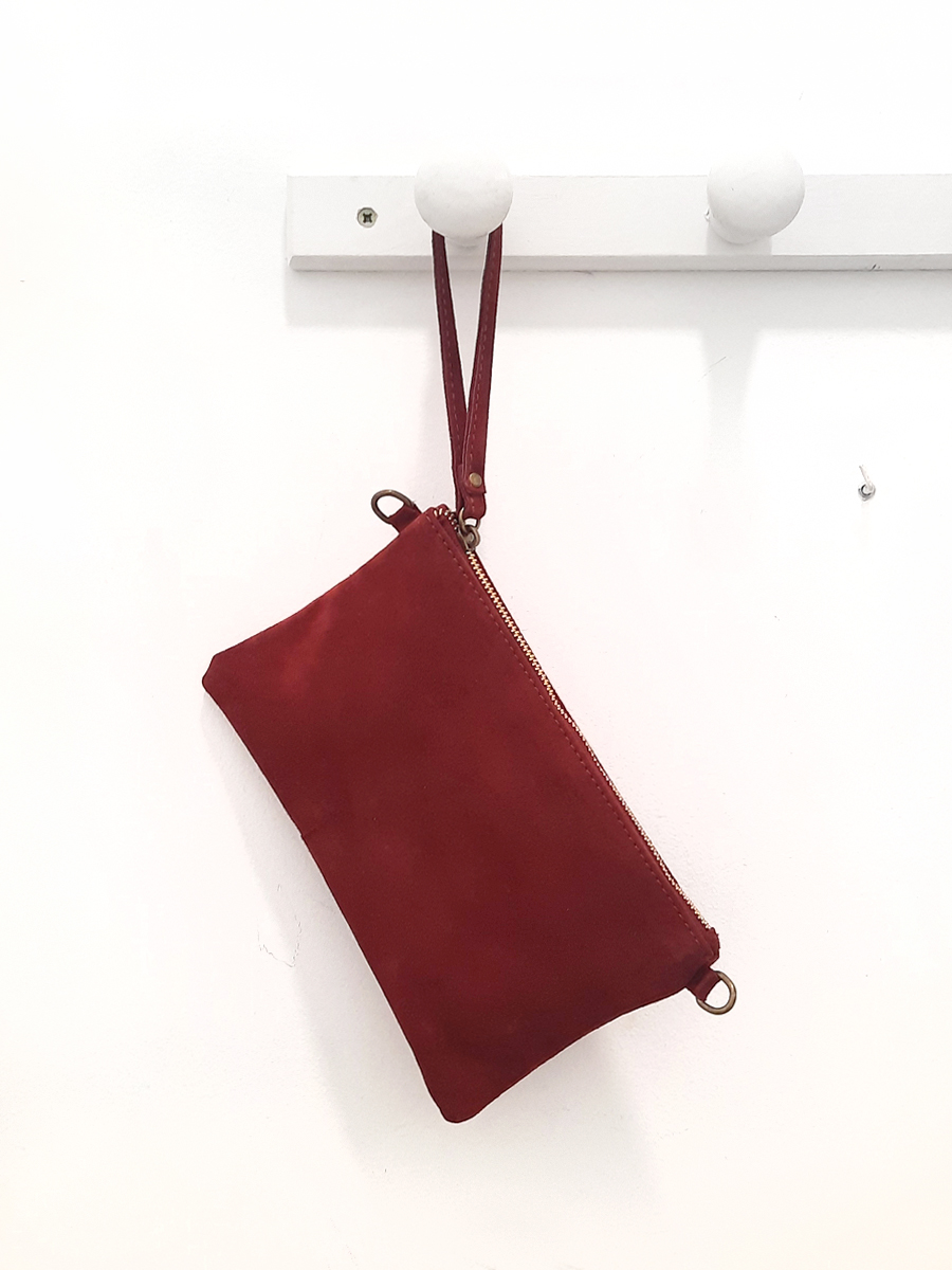 Clutch burdeos Emily con cremallera de un único departamento y accesorio para colgar a modo de bolso. Interior con forro en color negro.