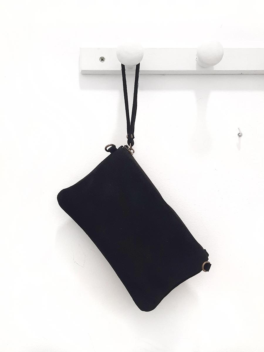 Clutch negro Emily con cremallera de un único departamento y accesorio para colgar a modo de bolso. Interior con forro en color negro.
