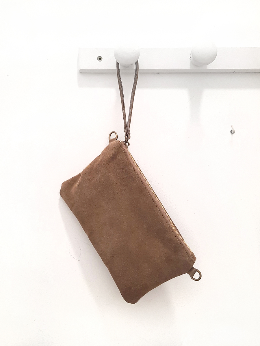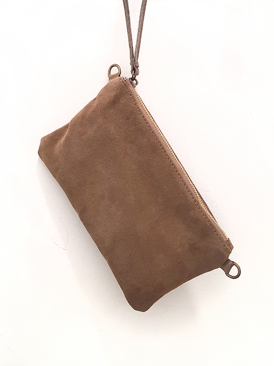Clutch taupé Emily con cremallera dorada de un único departamento y accesorio para colgar a modo de bolso. Interior con forro en color negro.