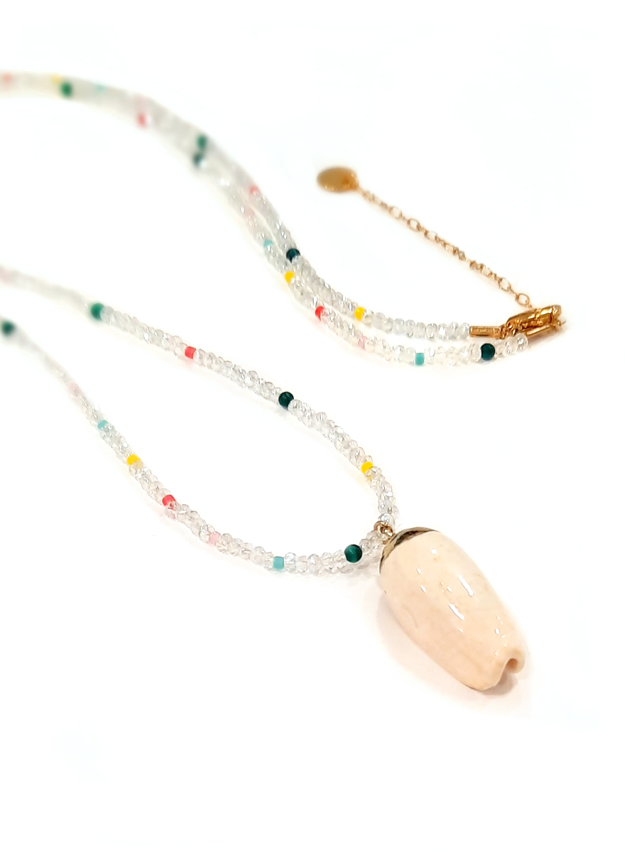 Colgante azul Maskorra de concha con piedritas en tono azul con diferentes colores intercalados. Aplique y cierre dorados. Largo de la cadena: 60 cm.