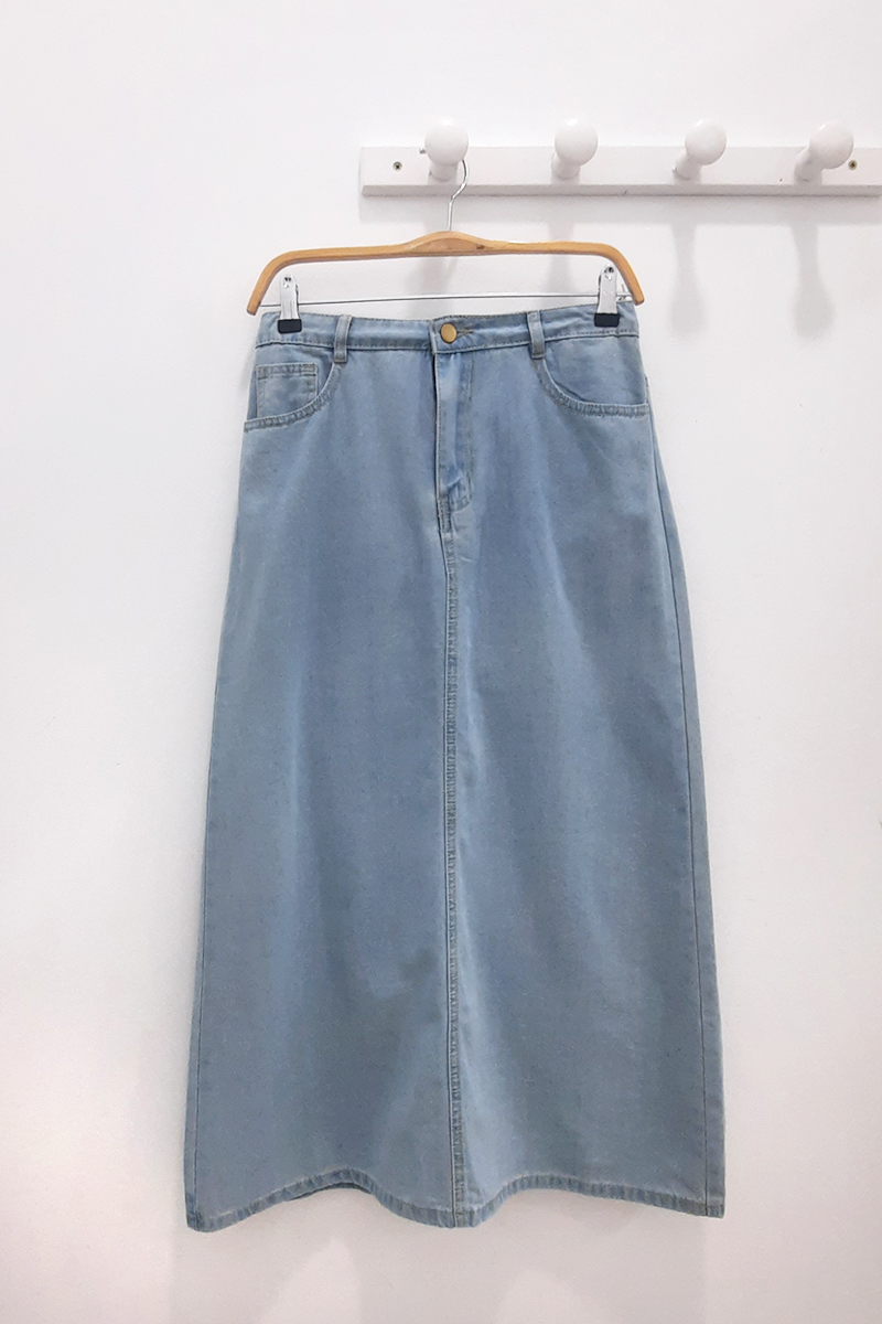 Falda vaquera larga Dona con bolsillos frontales y traseros. Tiene una pequeña apertura en el bajo trasero.