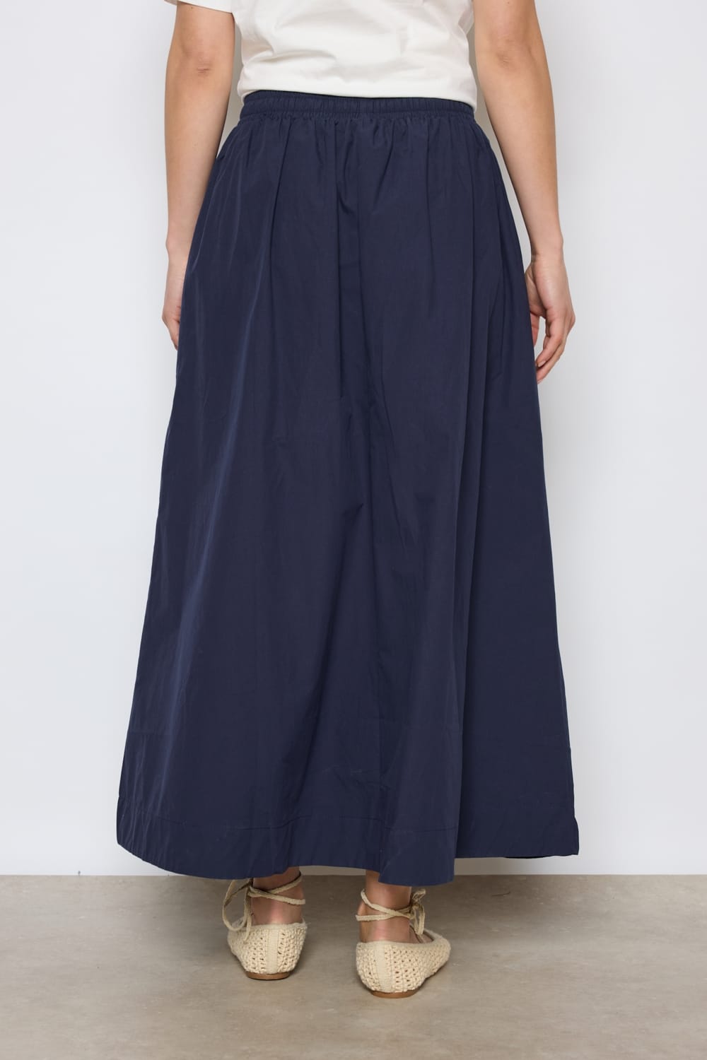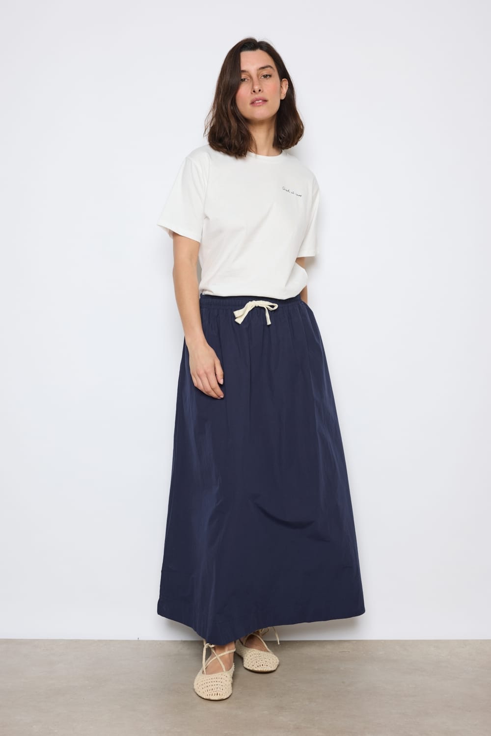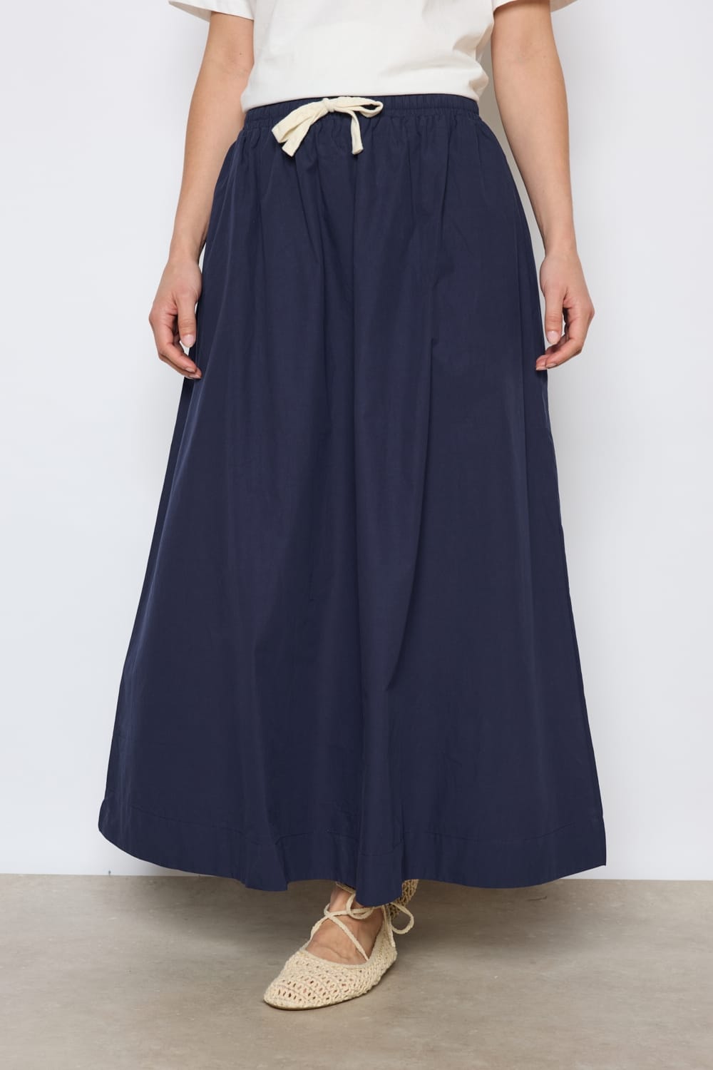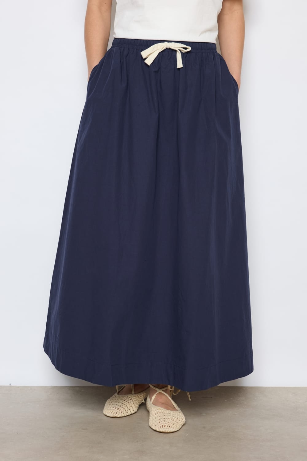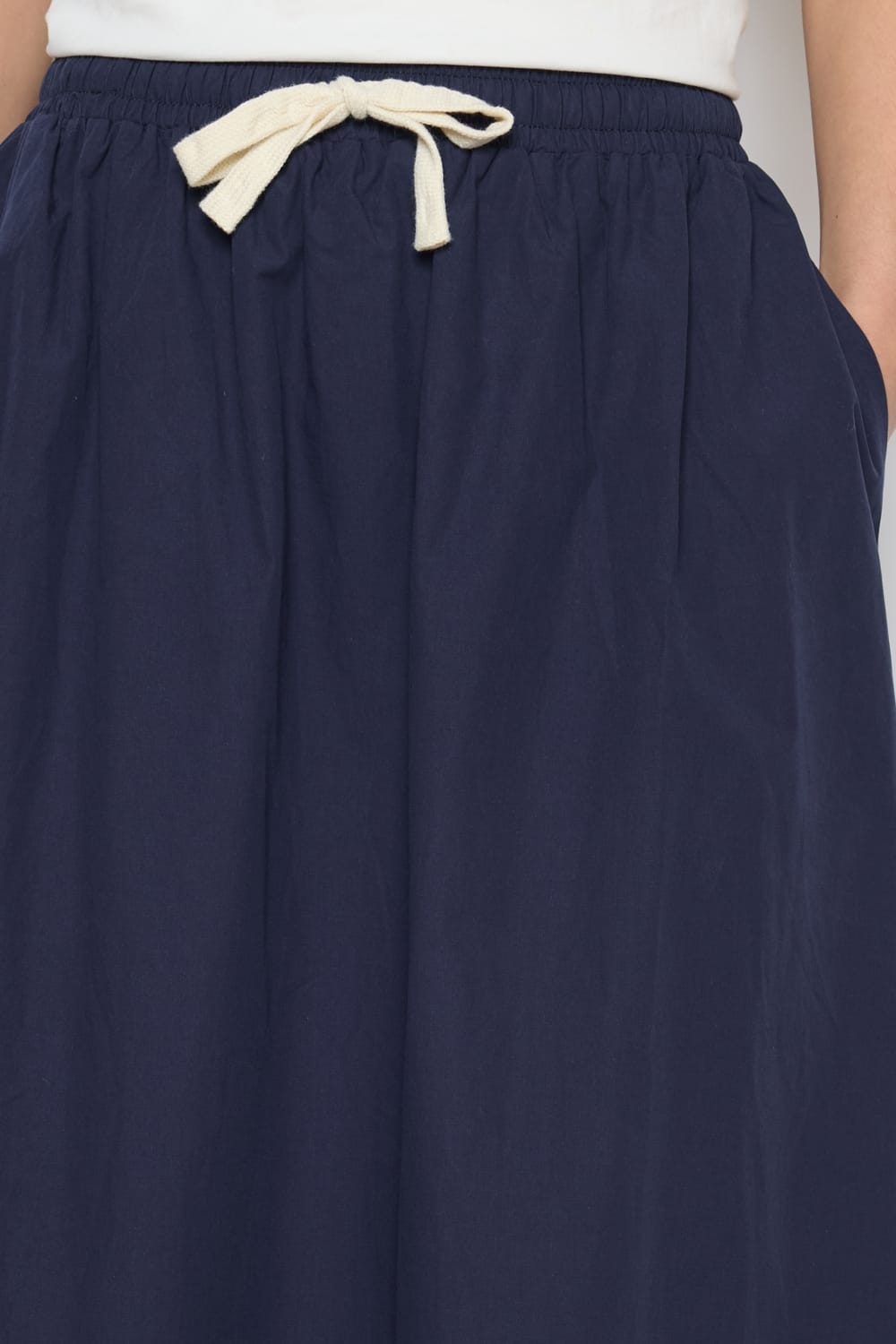 Falda larga azul marino Sibel con bolsillos en los costados siguiendo la línea de la costura y cintura elástica ajustable también mediante cordón en tono crudo.