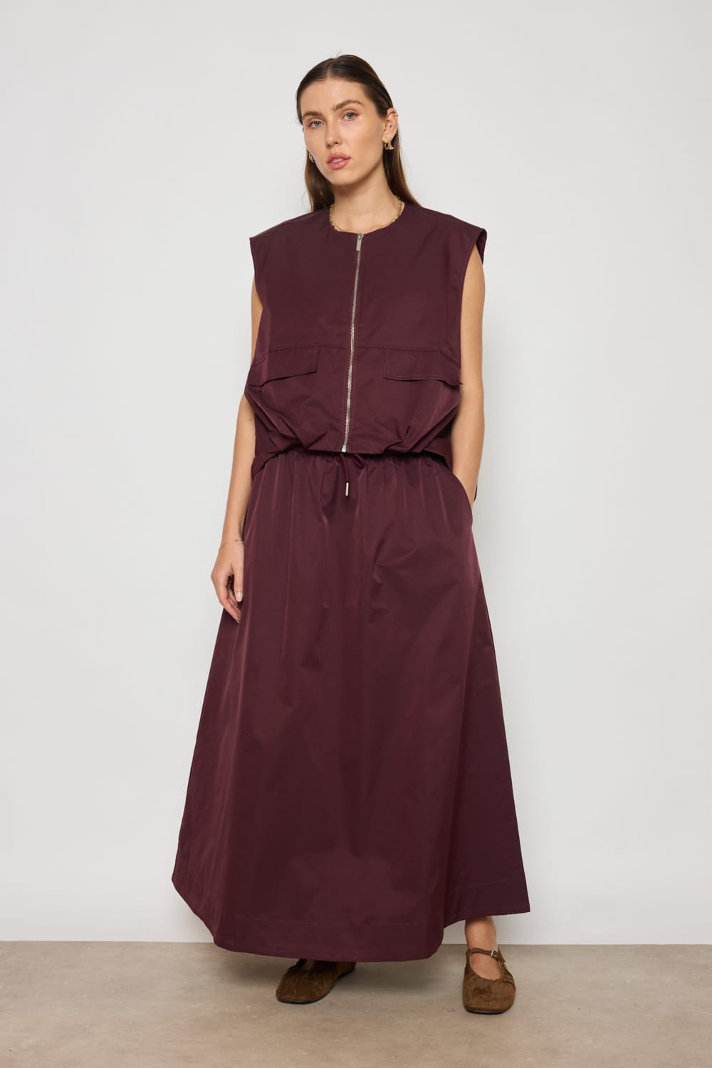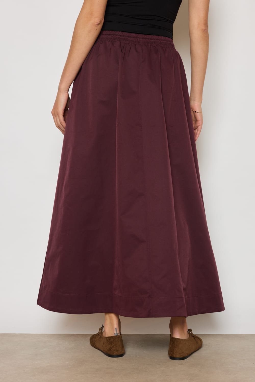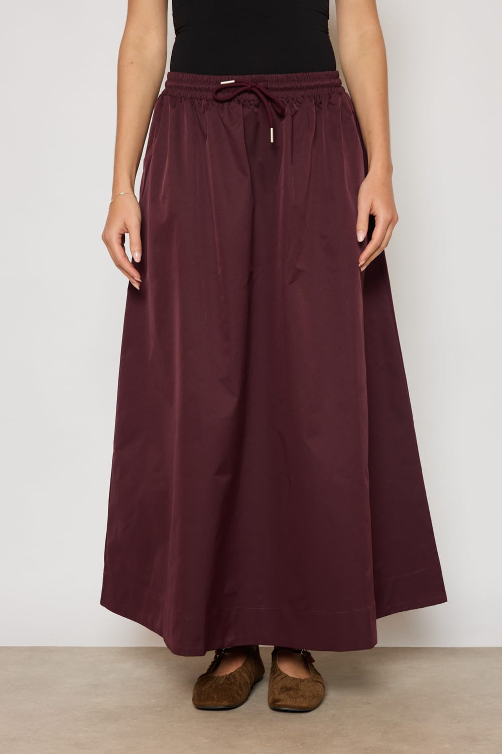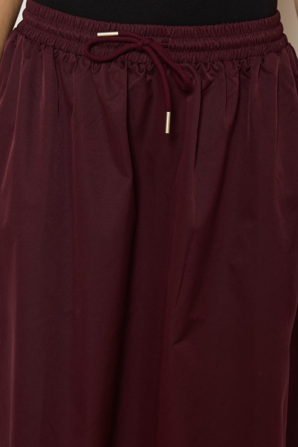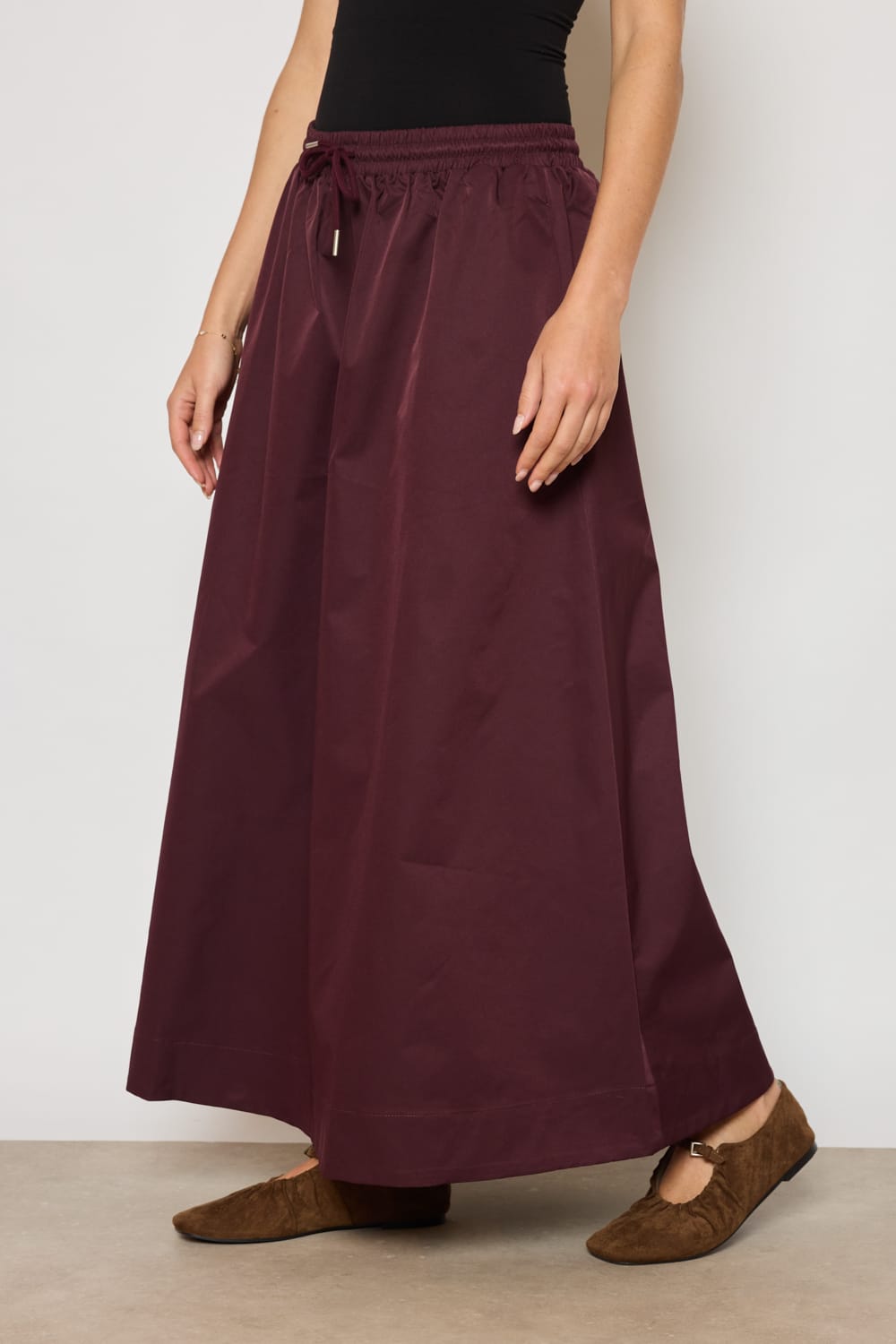 Falda larga granate Mayra con bolsillos en los costados siguiendo la línea de la costura y cintura elástica ajustable mediante cordón del mismo tono con remate metálico.
