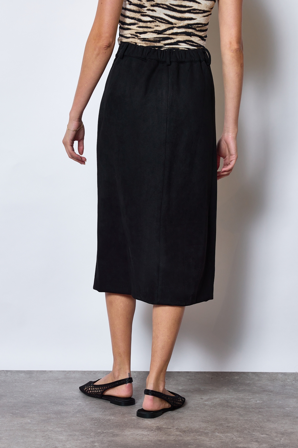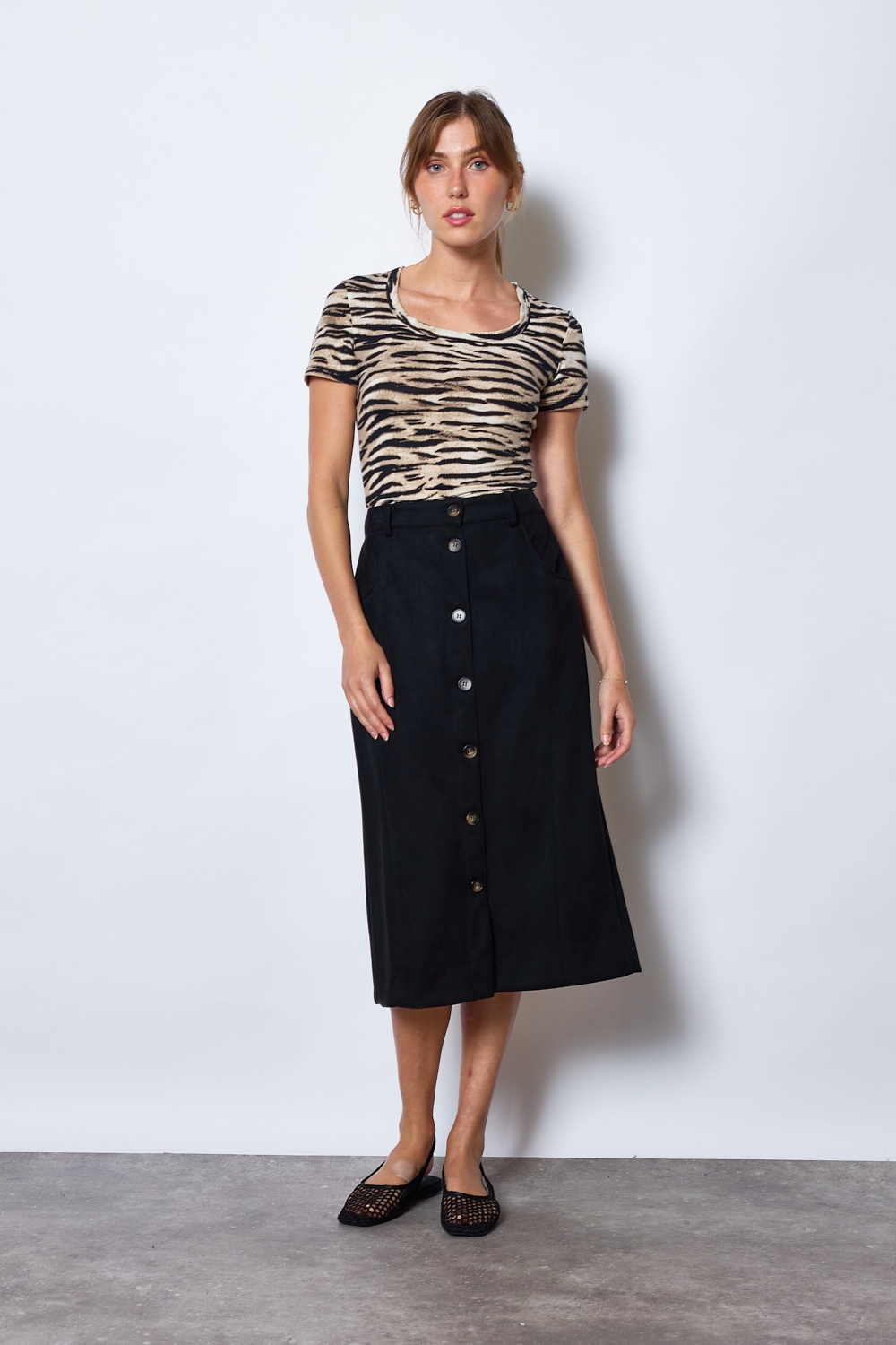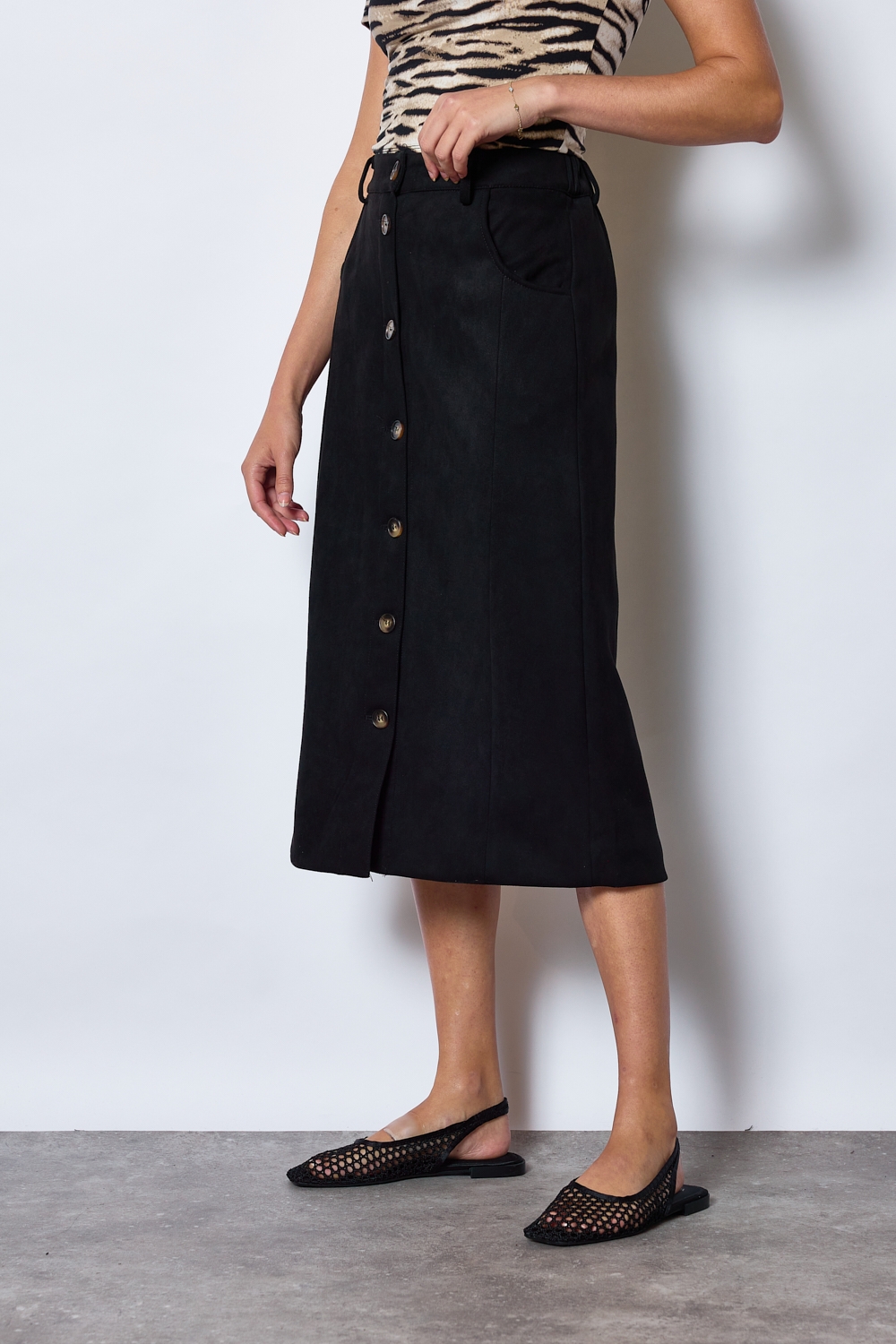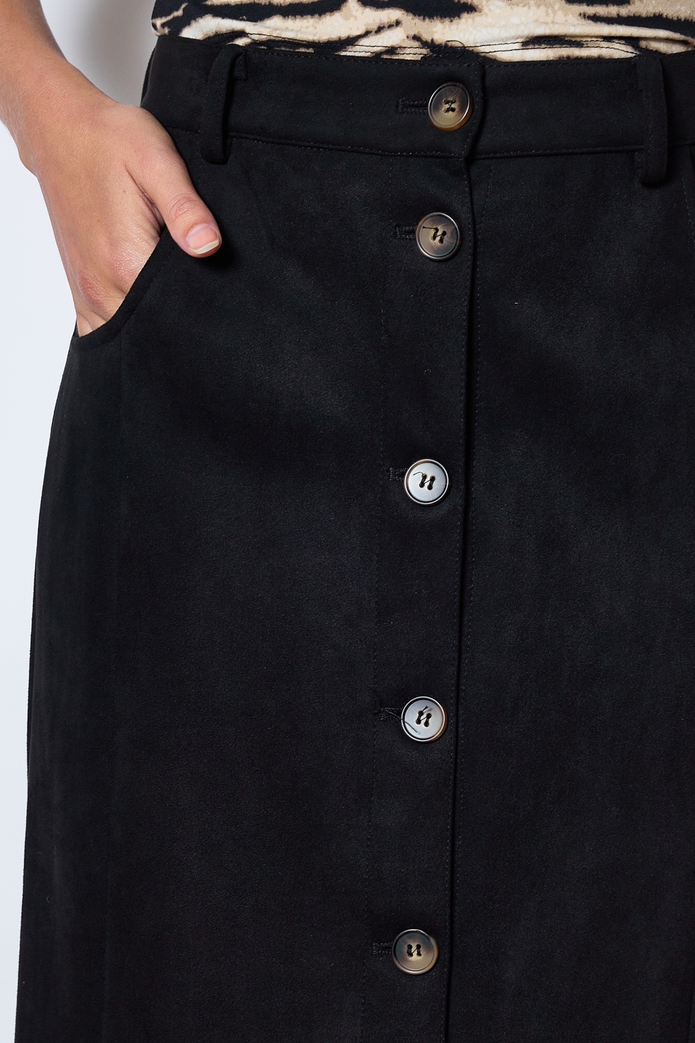 Falda de largura media en color negro con bolsillos redondeados, con presillas para cinturón y botonadura delantera. Botones en marrón claro y oscuro.