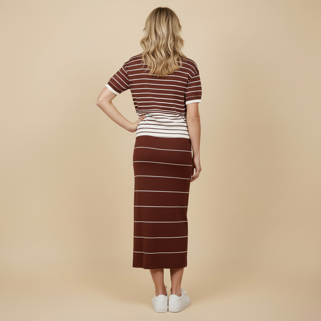 Falda de punto marrón crudo Jagger de largura media, estampado de rayas variables en esos mismo tonos y cintura elástica.