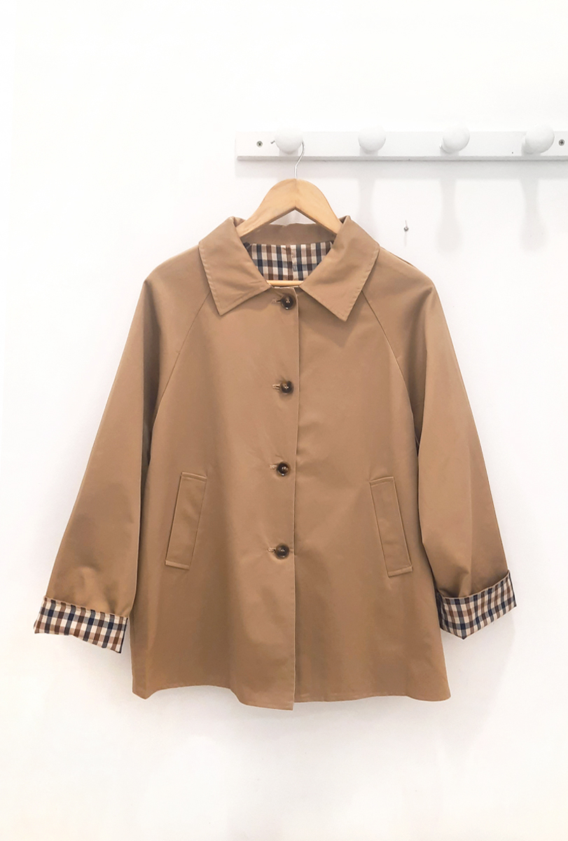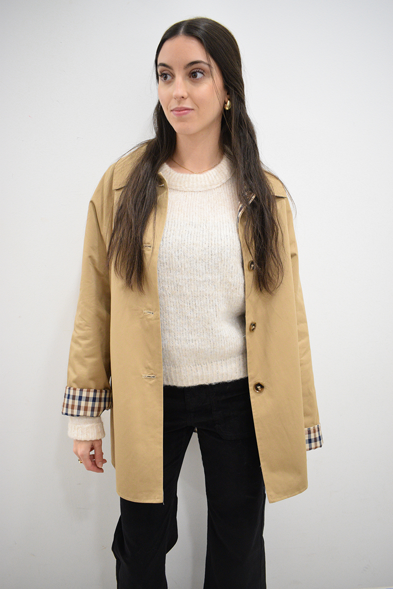 Gabardina camel reversible Morin con cuello en el mismo tono, botonera en marrón claro oscuro y bolsillos en diagonal en el lado camel. Parte reversible a cuadros marrones y azules, sin bolsillos y con cuello del mismo estampado.
