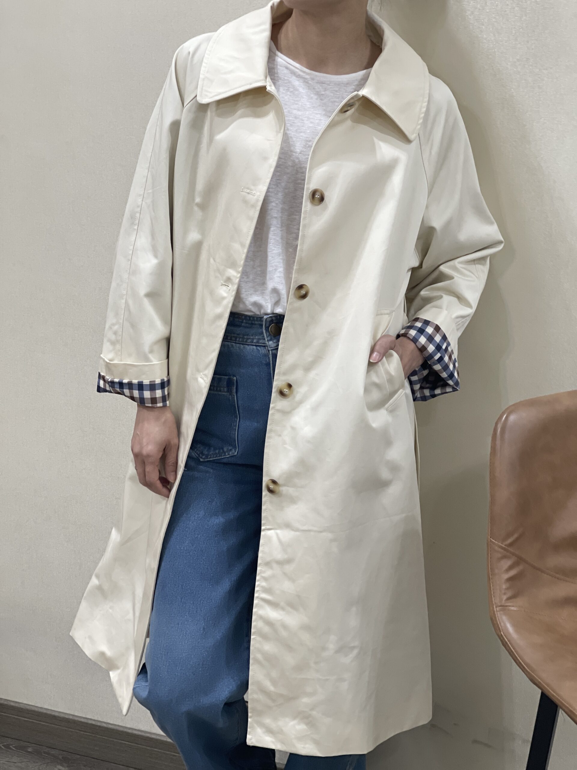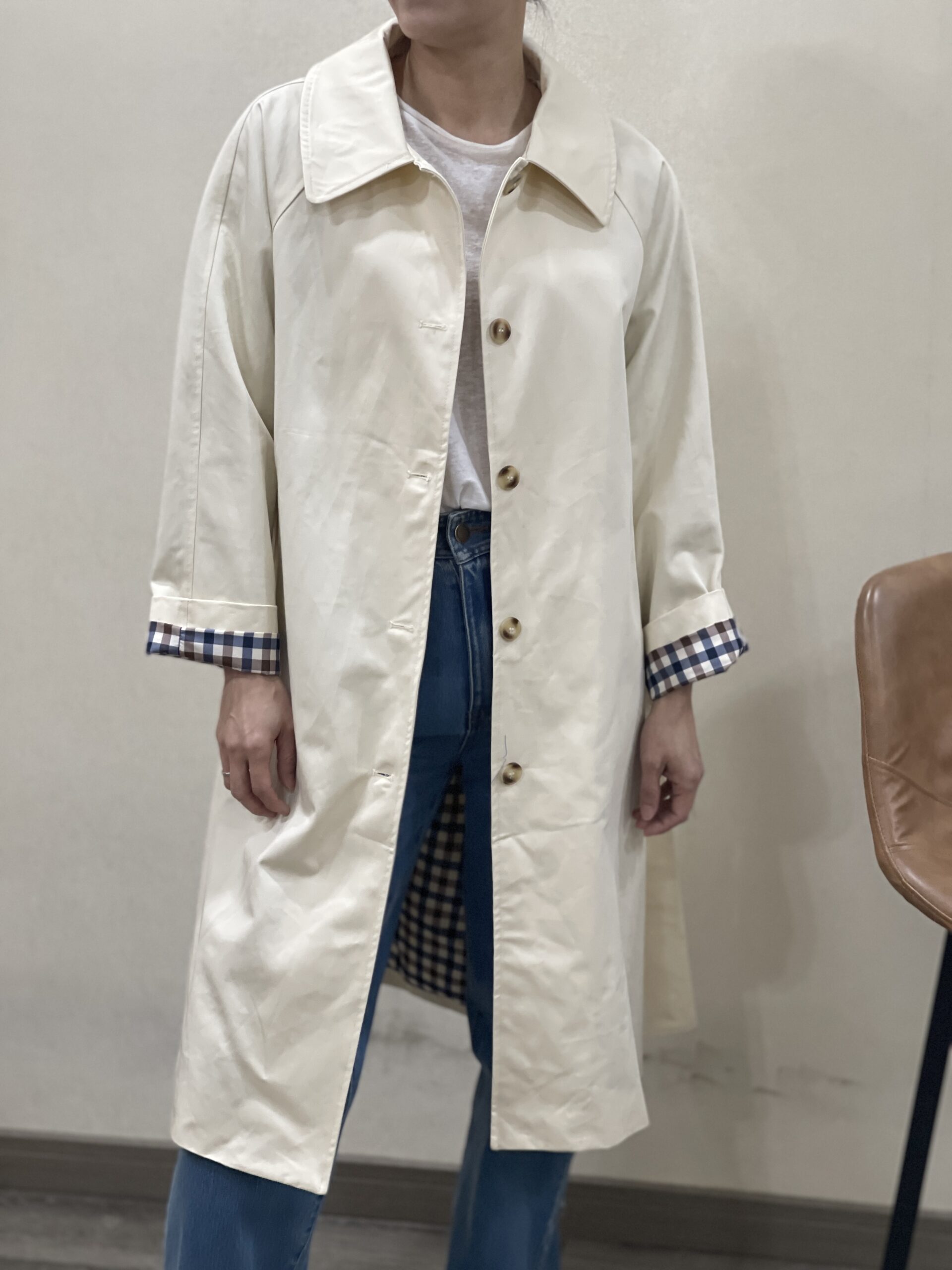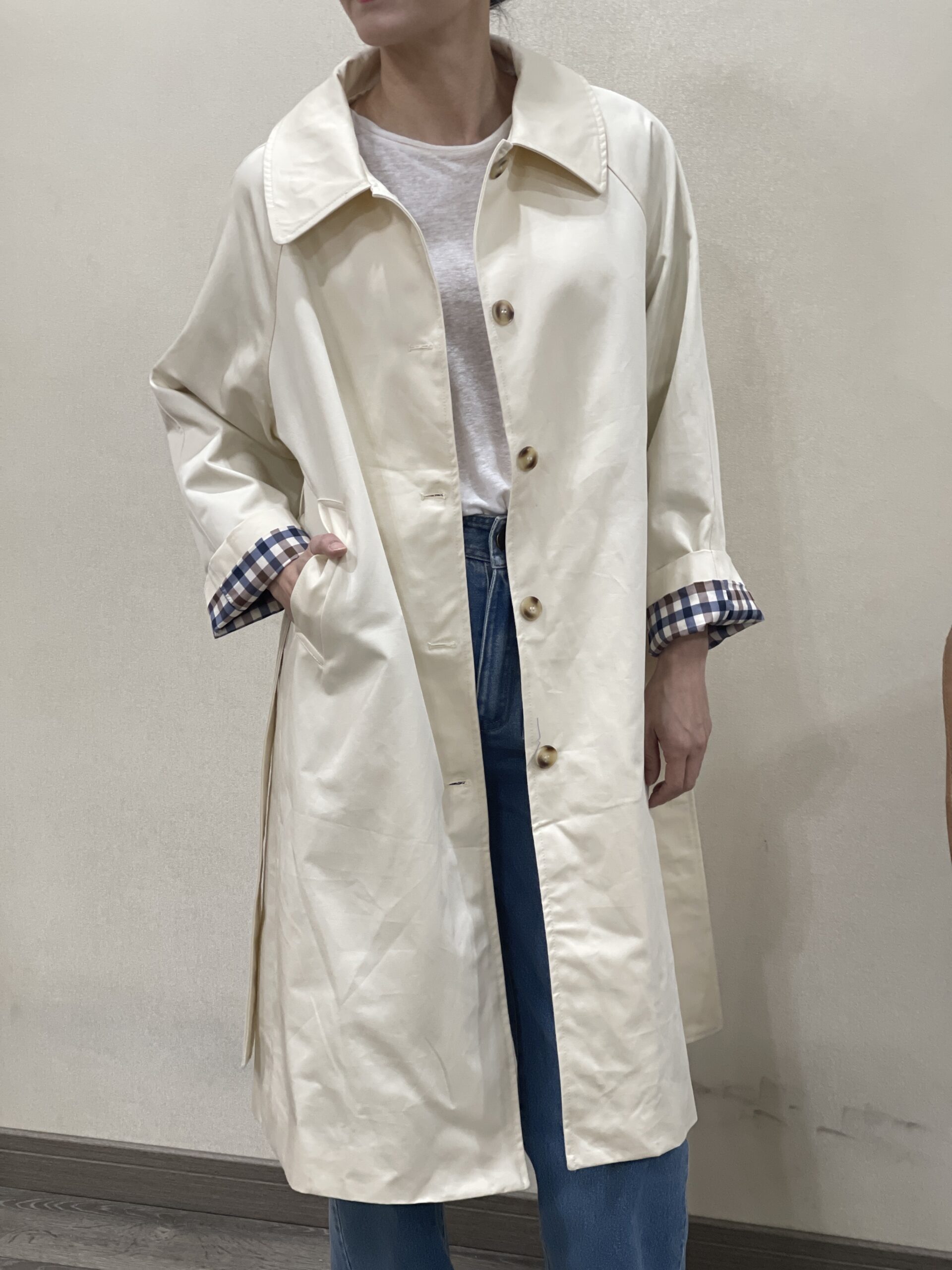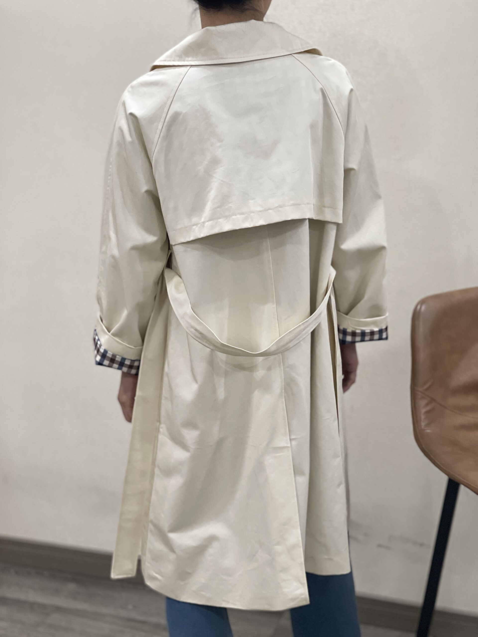 Gabardina color crudo Benedetta con cinturón y cuello del mismo tejido y color, botonera en marrón claro oscuro, bolsillos en diagonal y solapa trasera. Forro interior a cuadros marrones, azules y beiges.