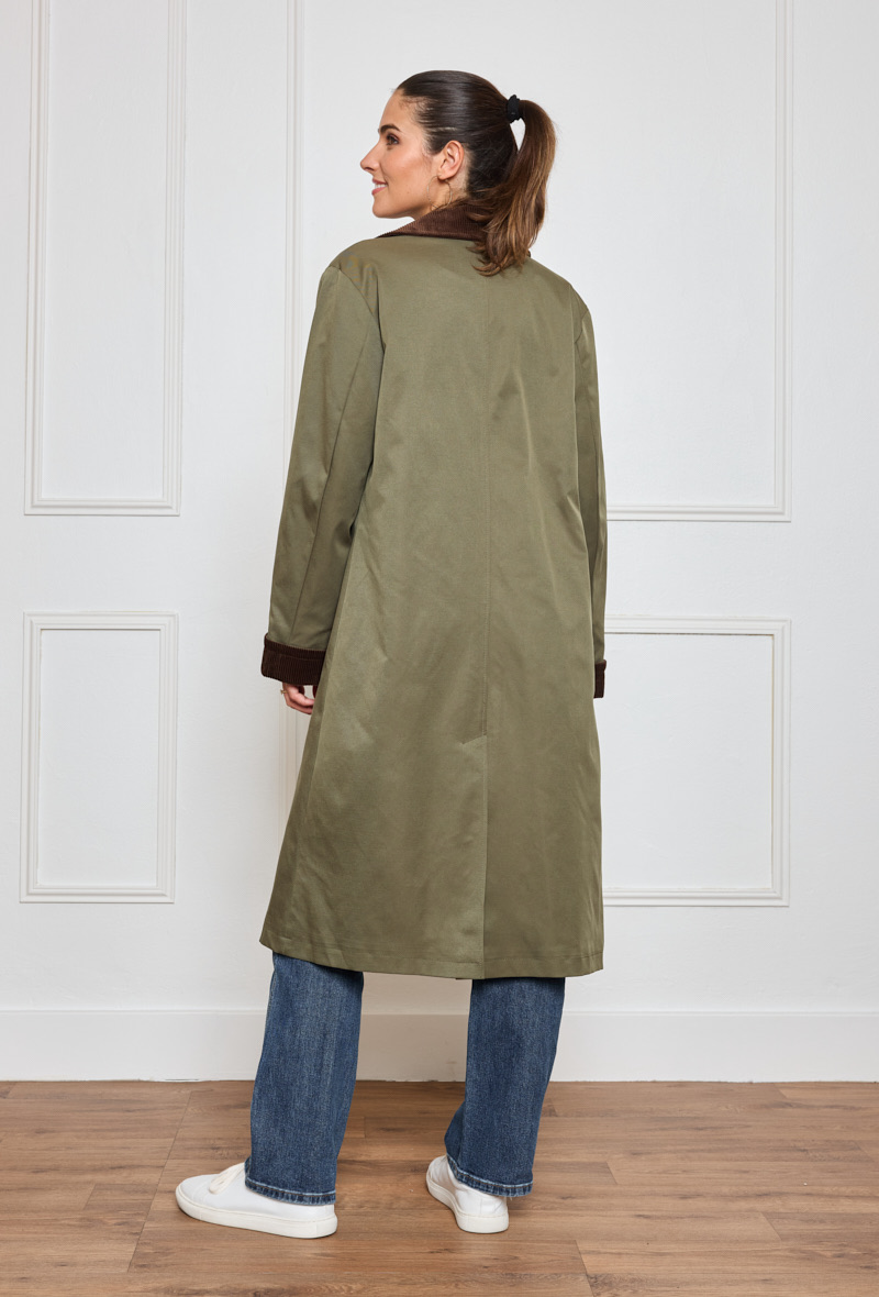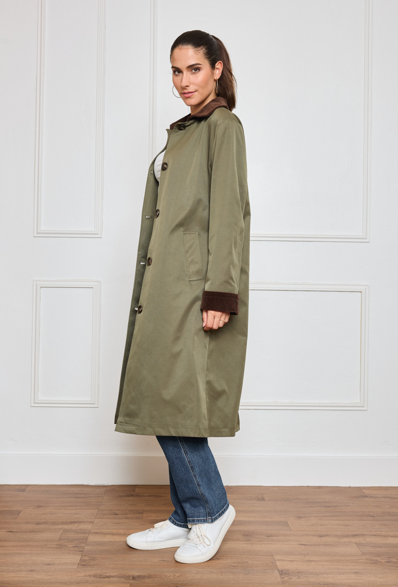 Gabardina kaki Alia con cuello de pana marrón, botonera en marrón claro oscuro y bolsillos en diagonal. Forro interior color beige.