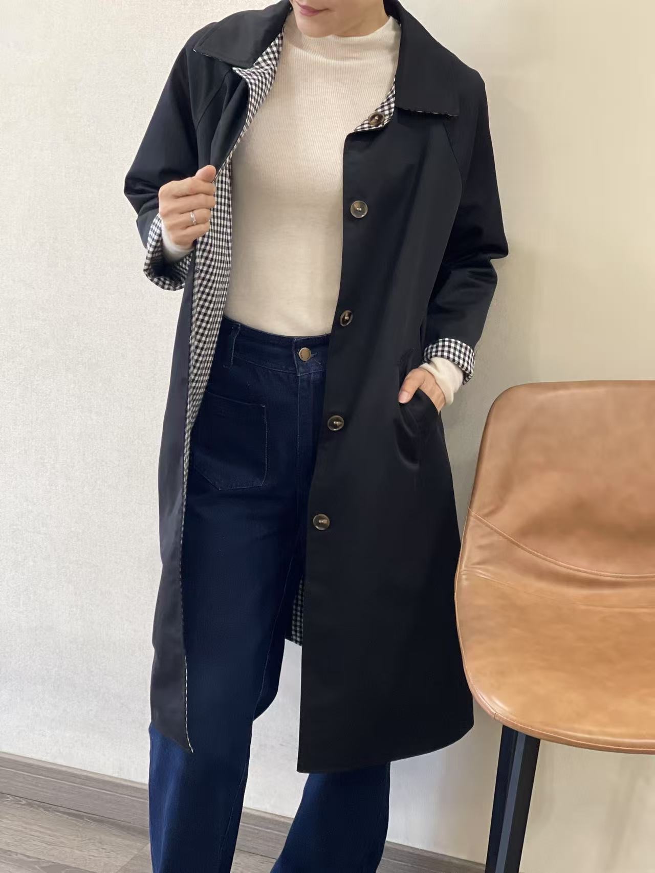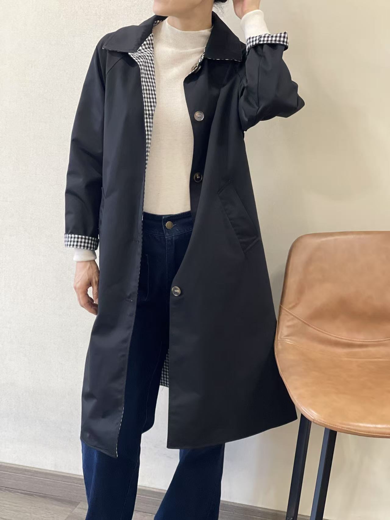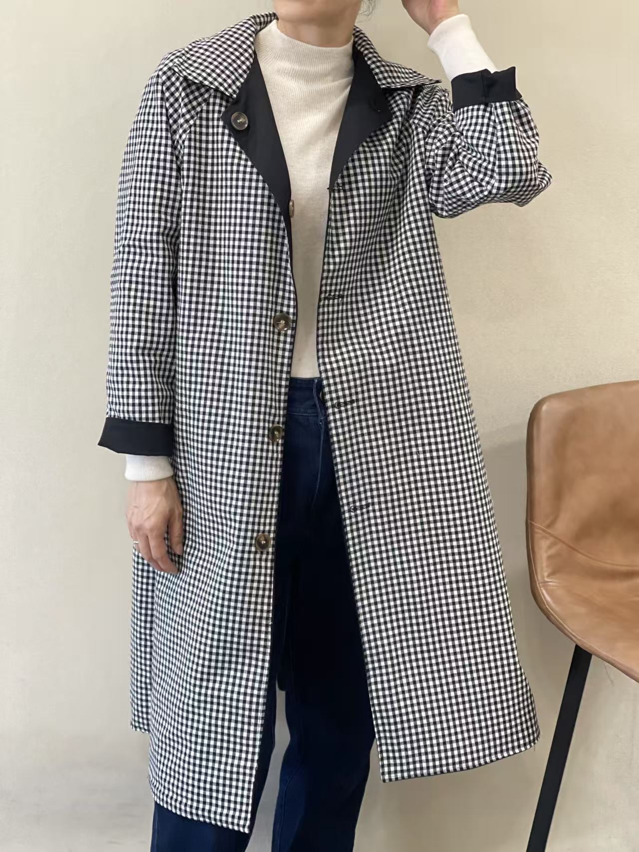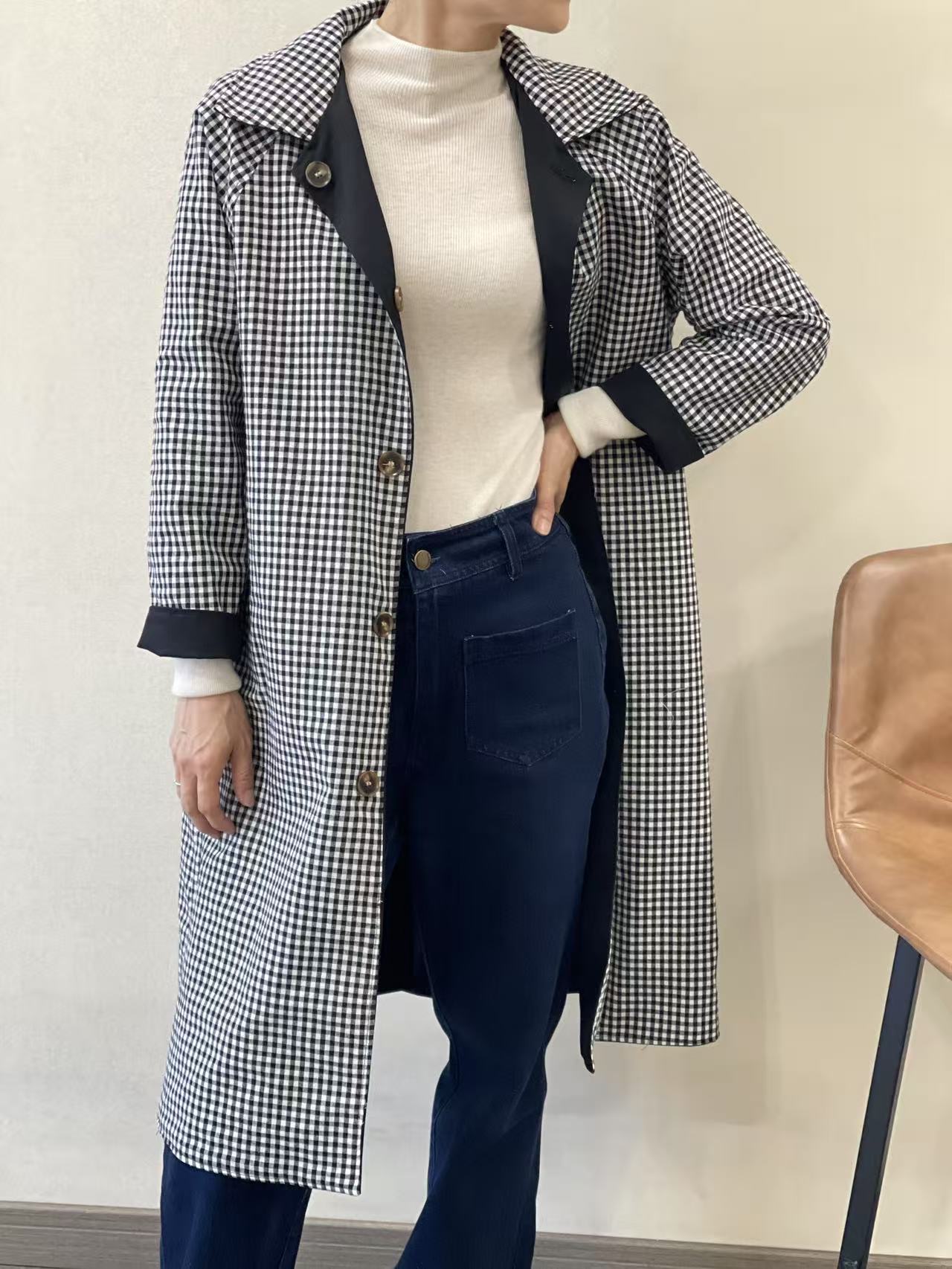Gabardina negra reversible Helene con cuello en el mismo tono, botonera en marrón claro oscuro y bolsillos en diagonal en el lado negro. Parte reversible a cuadros negros, grises y blancos, sin bolsillos y cuello del mismo estampado.
